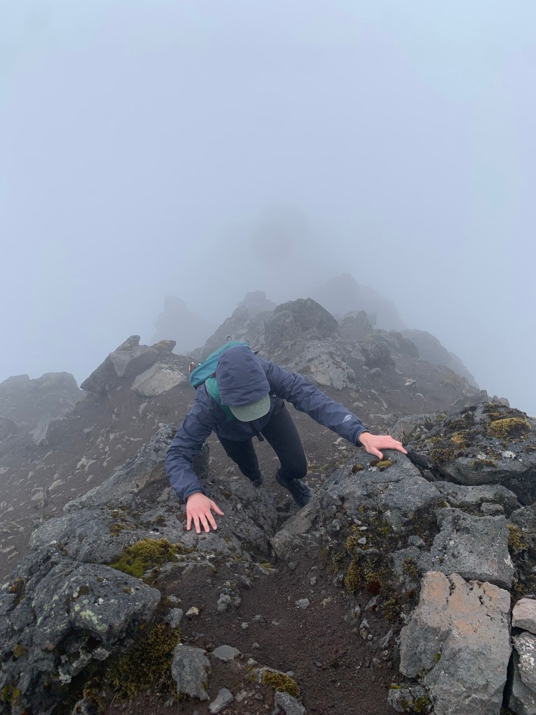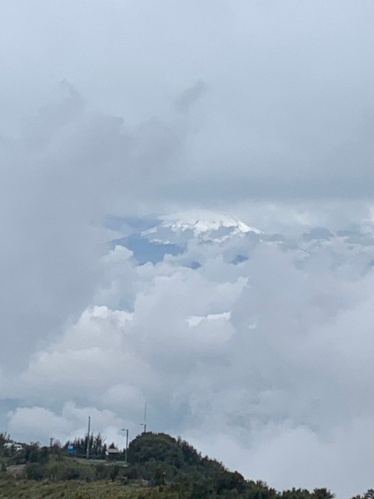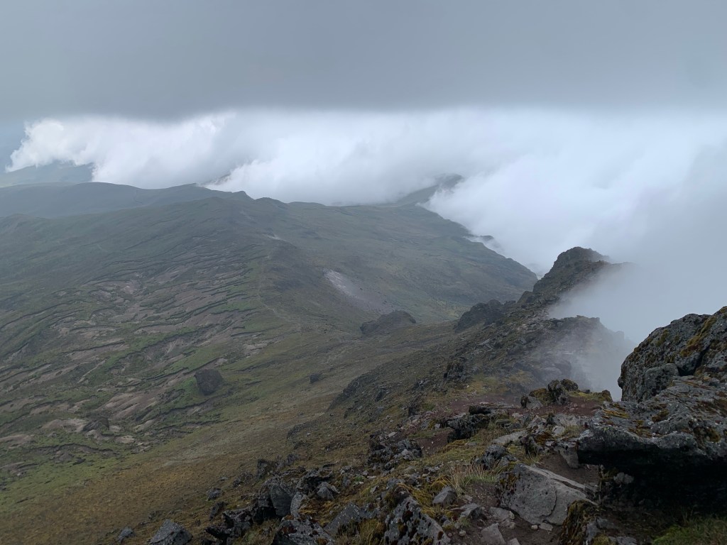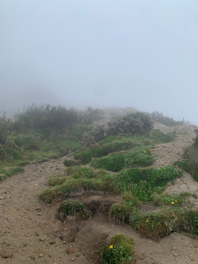 Als wir am nächsten Tag nach einem nahrhaften Frühstück bei strahlendem Sonnenschein uns auf den Weg machten, waren wir guter Dinge. Beim Eingang in das Gebiet/den Nationalpark, sagte uns der Guide nochmal ausdrücklich, dass man ohne Helm nicht auf den Gipfel soll/kann. Wir sagten “Jaja wollen wir eh nicht” und wurden hineingelassen. Beim Aufstieg durch das sanfte Paramo-Gelände wurden wir durch die gut ausgerüsteten anderen Gruppen noch ein wenig weiter verunsichert. Nachdem wir das erste steile Stück auf den Grad des Berges hinauf gut überstanden haben, dachten wir uns die sind alle extreme Hosenscheißer. Als wir dann den restlichen Grad bei geschätzter Sichtweite von 5-10 Metern bewältigten, stellte sich heraus, dass vielleicht doch etwas dran war an all den Empfehlungen. Nichts desto trotz erreichten wir den Gipfel erfolgreich (auch in einer ganz guten Zeit) und kehrten heil wieder zurück. Nach ca 1000 Höhenmeter (von 3700 auf 4790 und wieder zurück) und ungefähren 14km Distanz, waren wir froh als uns 3 Ecuadorianerinnen die 6km vom Parkplatz bis zur nächsten Bushaltestelle mitnahmen. Von dort hatten wir recht Glück mit den Verkehrsmitteln und waren dann relativ zeitig wieder in unserer Wohnung. Gekocht hatten wir schon im vorhinein, also hieß es nur mehr entspannen und Füße baumeln lassen.Doch allzu lang war die Entspannung nicht, den am Sonntag hieß es 5-6h mit dem Bus nach Shell zu fahren (zuerst durch die Avenida de los volcanos und dann durch die Ruta de las Cascadas, eigentlich eine schöne Strecke:)), damit wir dort bevor das Spital um 17:00 zusperrt unsere (getrennten) Zimmer beziehen können. Gut angekommen, waren wir erstmal ein bisschen erdrückt von der Hitze und Luftfeuchtigkeit, und suchten vergebens nach einem netten Cafe im Ort um ein wenig runter zu kommen. Wir fuhren dann Abends noch mit einem ecuadorianischen Kommilitonen nach Puyo (ca 15. min entfernt und schon eher eine Kleinstadt) um uns dort mit einer weiteren Studentin und einem Assistenzarzt zum Abendessen zu treffen. Oder so dachten wir. Die beiden waren beim Antreffen nämlich schon etwas beduselt und es ging auch gleich flüssig weiter. Geendet hat der Abend schließlich weil den anderen das Geld ausging und wir schon Sorgen hatten, ob wir in den Beifahrersitzen vom Doc noch heil in Shell ankommen. Es war ein lustiger Abend, aber die Autofahrt war schon etwas kritisch.