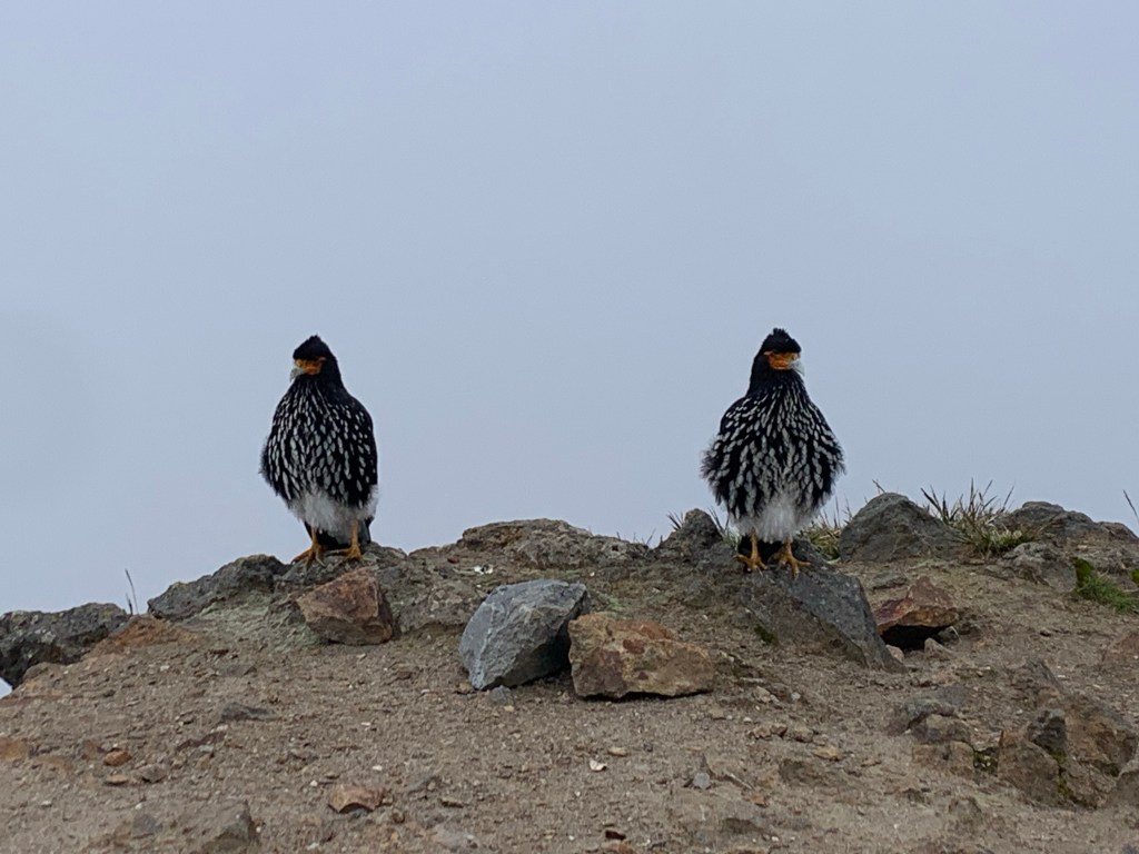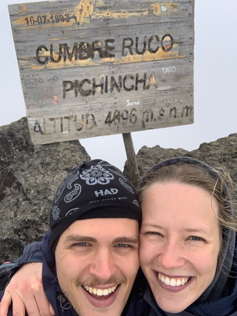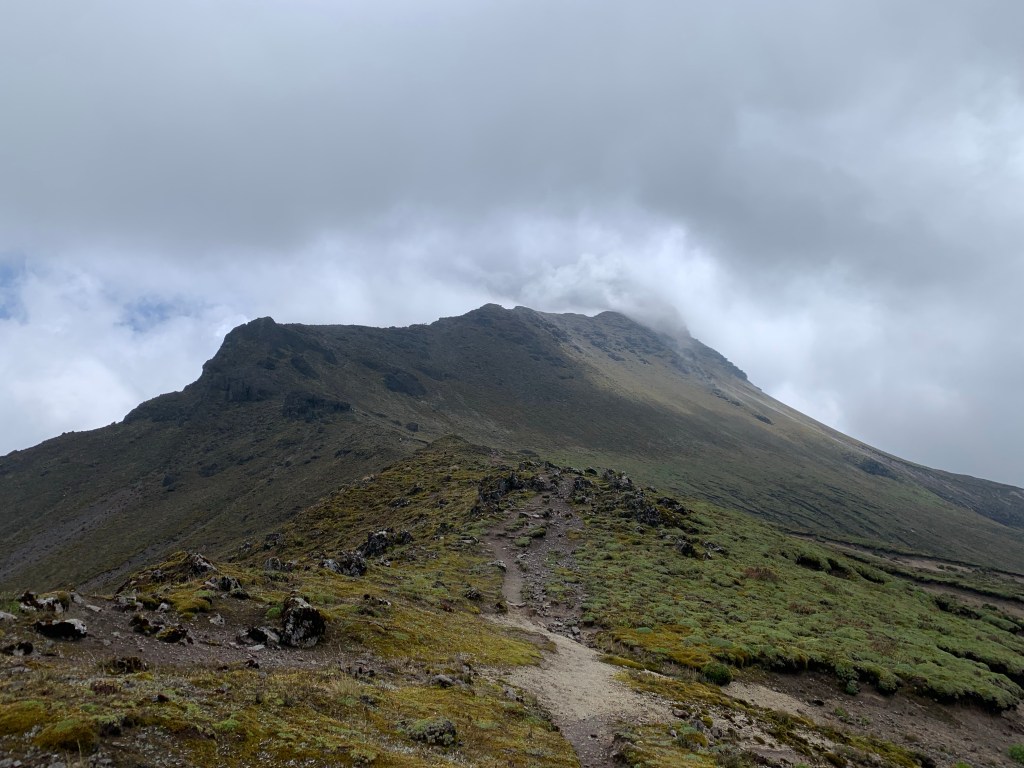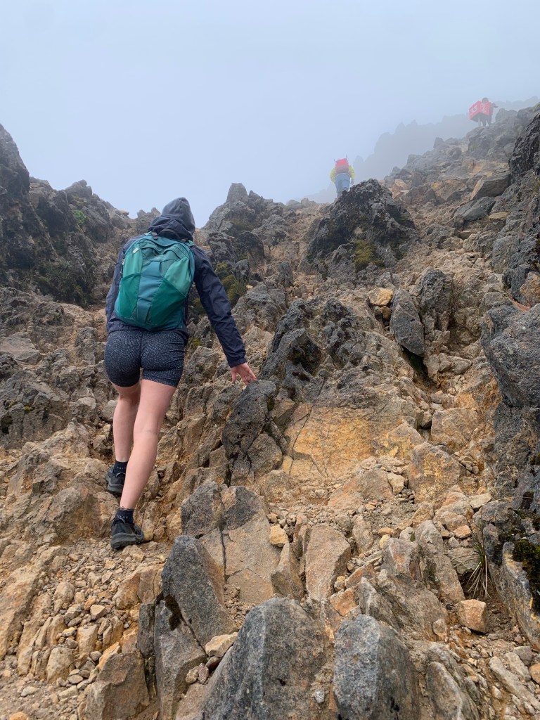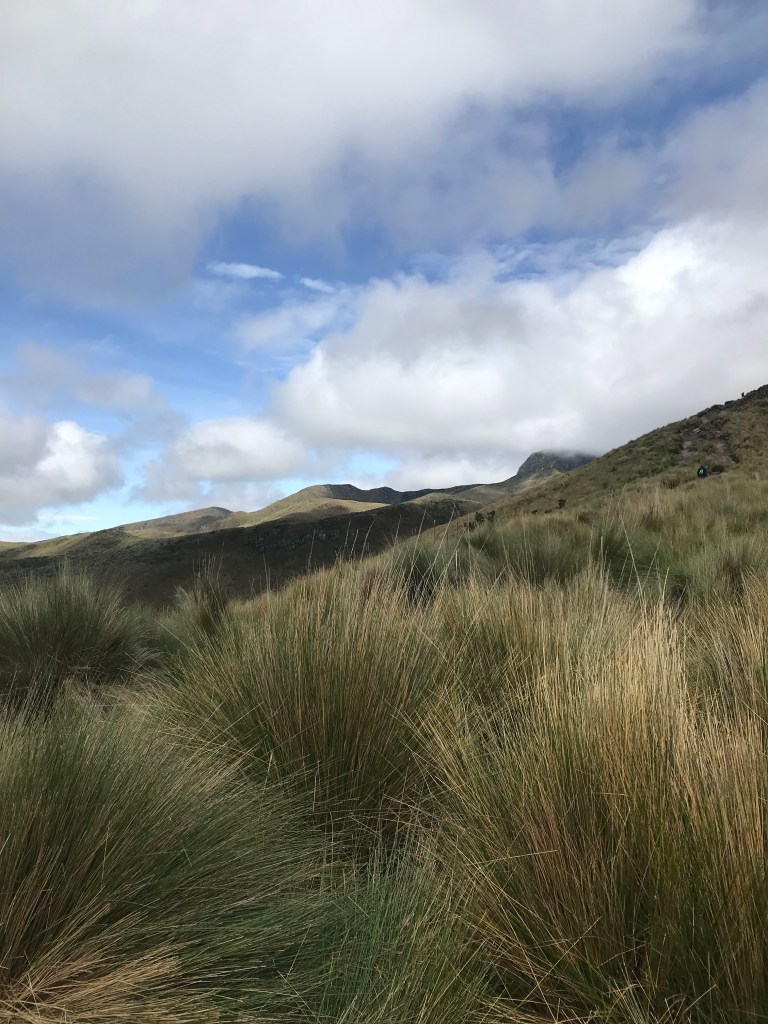 Als wir am nächsten Tag nach einem nahrhaften Frühstück bei strahlendem Sonnenschein uns auf den Weg machten, waren wir guter Dinge. Beim Eingang in das Gebiet/den Nationalpark, sagte uns der Guide nochmal ausdrücklich, dass man ohne Helm nicht auf den Gipfel soll/kann. Wir sagten “Jaja wollen wir eh nicht” und wurden hineingelassen. Beim Aufstieg durch das sanfte Paramo-Gelände wurden wir durch die gut ausgerüsteten anderen Gruppen noch ein wenig weiter verunsichert. Nachdem wir das erste steile Stück auf den Grad des Berges hinauf gut überstanden haben, dachten wir uns die sind alle extreme Hosenscheißer. Als wir dann den restlichen Grad bei geschätzter Sichtweite von 5-10 Metern bewältigten, stellte sich heraus, dass vielleicht doch etwas dran war an all den Empfehlungen. Nichts desto trotz erreichten wir den Gipfel erfolgreich (auch in einer ganz guten Zeit) und kehrten heil wieder zurück. Nach ca 1000 Höhenmeter (von 3700 auf 4790 und wieder zurück) und ungefähren 14km Distanz, waren wir froh als uns 3 Ecuadorianerinnen die 6km vom Parkplatz bis zur nächsten Bushaltestelle mitnahmen. Von dort hatten wir recht Glück mit den Verkehrsmitteln und waren dann relativ zeitig wieder in unserer Wohnung. Gekocht hatten wir schon im vorhinein, also hieß es nur mehr entspannen und Füße baumeln lassen.Doch allzu lang war die Entspannung nicht, den am Sonntag hieß es 5-6h mit dem Bus nach Shell zu fahren (zuerst durch die Avenida de los volcanos und dann durch die Ruta de las Cascadas, eigentlich eine schöne Strecke:)), damit wir dort bevor das Spital um 17:00 zusperrt unsere (getrennten) Zimmer beziehen können. Gut angekommen, waren wir erstmal ein bisschen erdrückt von der Hitze und Luftfeuchtigkeit, und suchten vergebens nach einem netten Cafe im Ort um ein wenig runter zu kommen. Wir fuhren dann Abends noch mit einem ecuadorianischen Kommilitonen nach Puyo (ca 15. min entfernt und schon eher eine Kleinstadt) um uns dort mit einer weiteren Studentin und einem Assistenzarzt zum Abendessen zu treffen. Oder so dachten wir. Die beiden waren beim Antreffen nämlich schon etwas beduselt und es ging auch gleich flüssig weiter. Geendet hat der Abend schließlich weil den anderen das Geld ausging und wir schon Sorgen hatten, ob wir in den Beifahrersitzen vom Doc noch heil in Shell ankommen. Es war ein lustiger Abend, aber die Autofahrt war schon etwas kritisch.