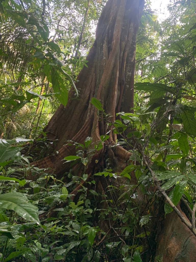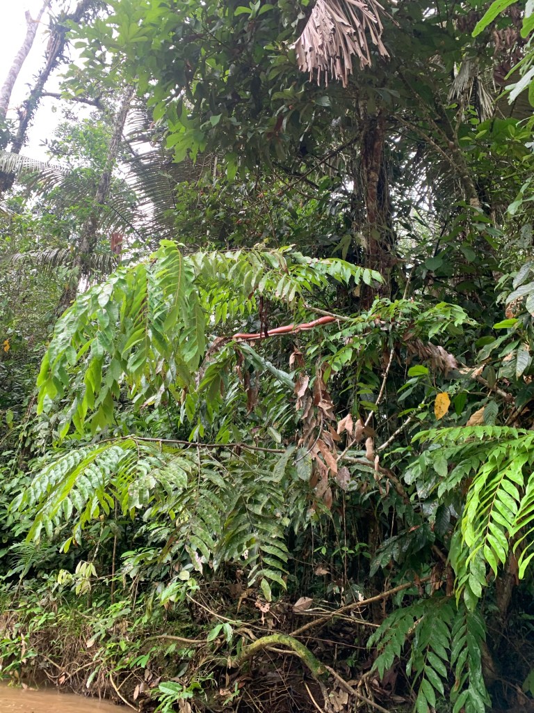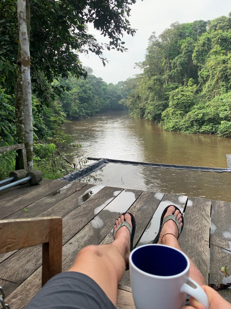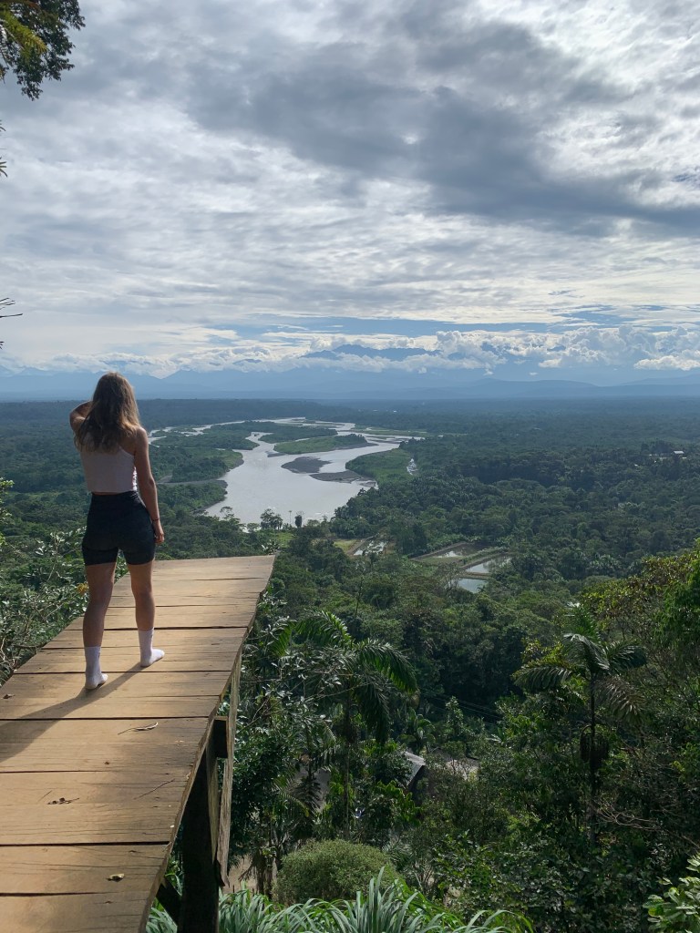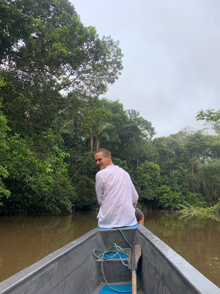 Das Quartier wo wir untergebracht waren, ist super schön. Es gab immer voll gutes Essen und es gab auch mehrere Hängematten, Sprungbrett, Stand-Up-Paddleboards usw. Wie fast alle Lodges waren wir direkt am Fluss, was für gute Aussichten sorgte. Wir unternahmen 2 Hikes durch den Regenwald, unser Guide war ein sehr kompetenter und lustiger Indigener (Siona People) der uns immer sehr viel erklärte. Einmal besuchten wir sein Dorf (Tarabeaya) und machten dort mit seiner Schwester selber “Brot” aus Yuca und hörten einem kurzem Vortrag vom Schamanen zu. Geheilt wird hier mit Hilfe der Geister und mit denen tritt man via Ayahuasca in Kontakt (wächst anscheinend nicht natürlich sondern wird von Schamanen angebaut). Außerdem gibt es gegen geläufigere Krankheiten (Husten, Bauchweh, Kopfweh usw) verschiedene Alkoholinfusionen, welche man stamperlweise trinkt, dann schön brav das Glas umdrehen und sich bei der Mutter Erde (Pachamama) bedanken. Zwei Mal fuhren wir zur nahe gelegenen Lagune um zu Baden, morgens machten wir zwei Mal eine Ausfahrt zum Birdwatching mit dem Boot, und auch nachts treibten wir uns im Regenwald herum.