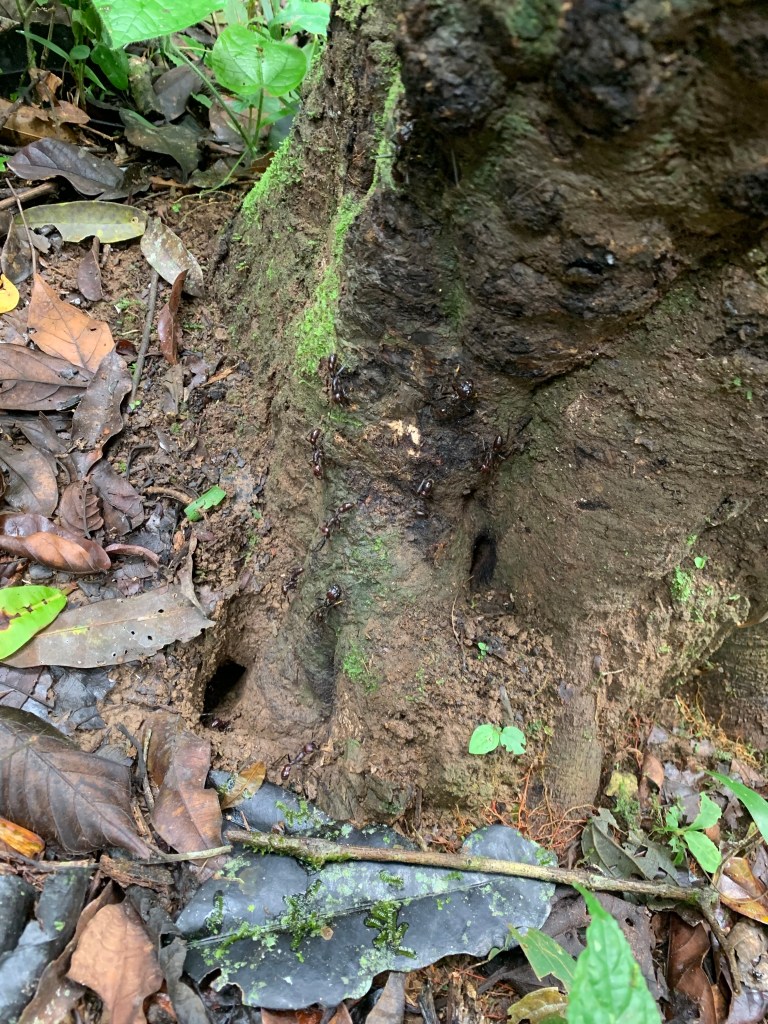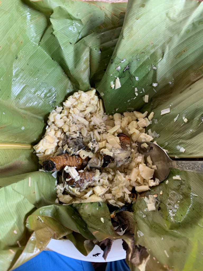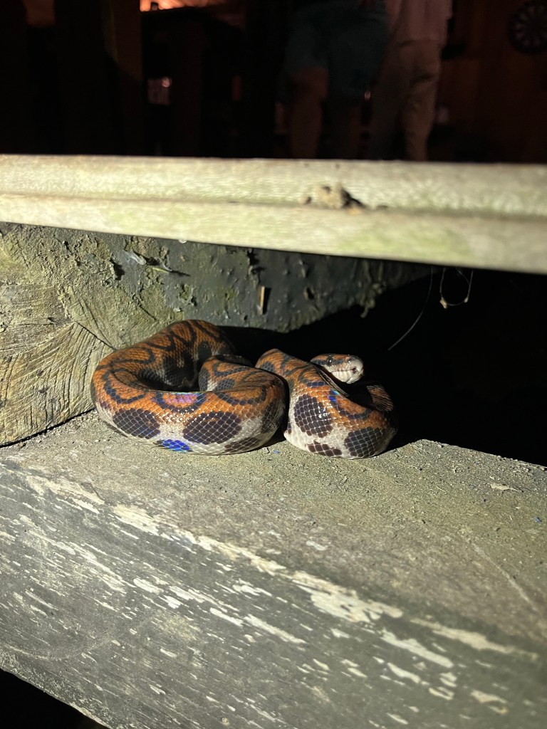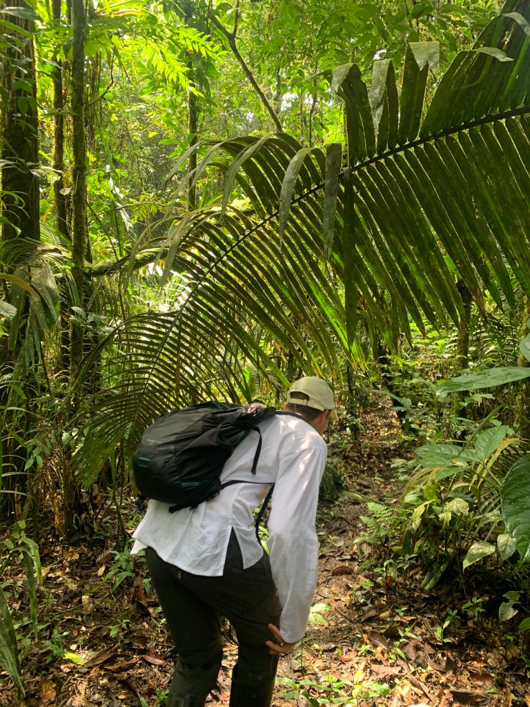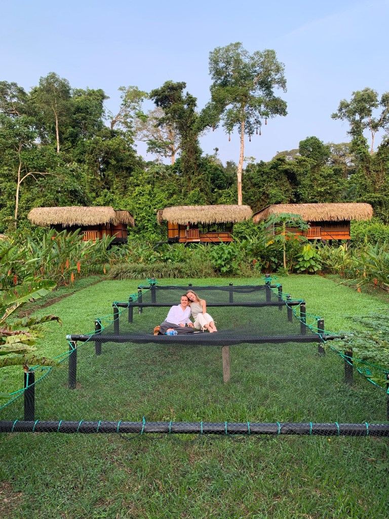 Das Quartier wo wir untergebracht waren, ist super schön. Es gab immer voll gutes Essen und es gab auch mehrere Hängematten, Sprungbrett, Stand-Up-Paddleboards usw. Wie fast alle Lodges waren wir direkt am Fluss, was für gute Aussichten sorgte. Wir unternahmen 2 Hikes durch den Regenwald, unser Guide war ein sehr kompetenter und lustiger Indigener (Siona People) der uns immer sehr viel erklärte. Einmal besuchten wir sein Dorf (Tarabeaya) und machten dort mit seiner Schwester selber “Brot” aus Yuca und hörten einem kurzem Vortrag vom Schamanen zu. Geheilt wird hier mit Hilfe der Geister und mit denen tritt man via Ayahuasca in Kontakt (wächst anscheinend nicht natürlich sondern wird von Schamanen angebaut). Außerdem gibt es gegen geläufigere Krankheiten (Husten, Bauchweh, Kopfweh usw) verschiedene Alkoholinfusionen, welche man stamperlweise trinkt, dann schön brav das Glas umdrehen und sich bei der Mutter Erde (Pachamama) bedanken. Zwei Mal fuhren wir zur nahe gelegenen Lagune um zu Baden, morgens machten wir zwei Mal eine Ausfahrt zum Birdwatching mit dem Boot, und auch nachts treibten wir uns im Regenwald herum.