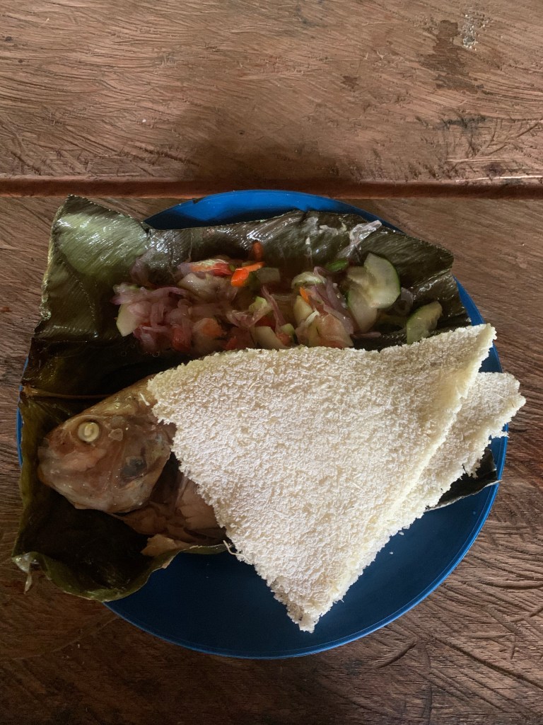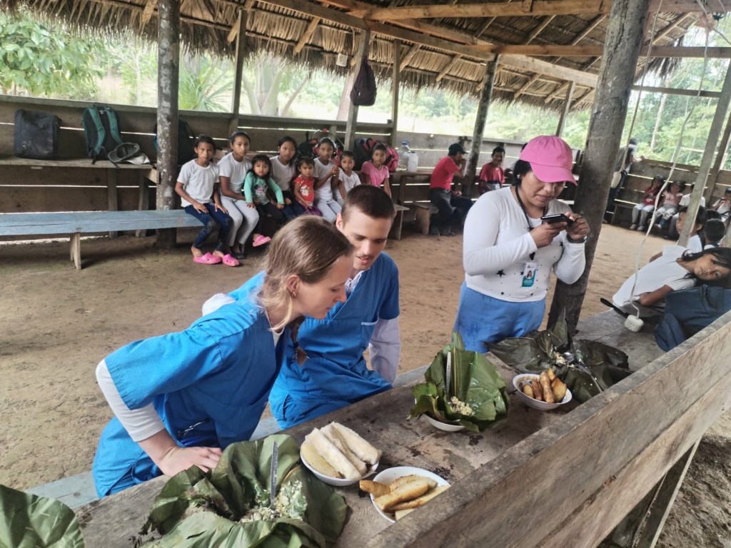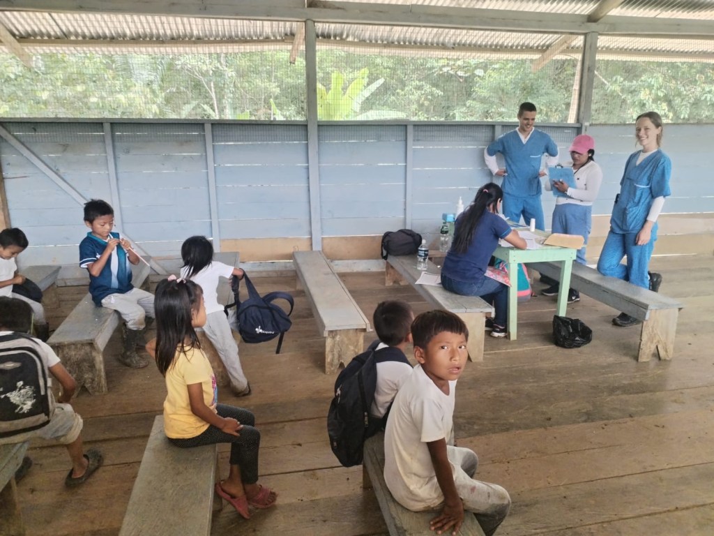 Für den Doc Jhon, die Krankenschwester Naty, 2 Mitarbeiter:innen von Compassion und uns Zwei ging es jedoch dann nochmal mit einem Taxi weiter zur Atakapi-Gemeinde. Dafür mussten wir ungefähr 1,5h eine nur mit 4WD bewältigbare Schotterstraße entlang fahren und auch 2-3 Flüße durchfahren. Der letzte Fluß erwies sich als zu tief, sodass wir zu Fuß queren mussten und dann noch ca 20 Minuten gingen. Angekommen in der Gemeinde, rief Raul alle Kinder in die Versammlungshütte und es wurden erstmal 2-3 christliche Kinderlieder gesungen. Dann bekamen wir leckeres (🥲) Amazonasessen aufgetischt, wir bekamen in Shell erklärt, dass es in deren Kultur mega unfreundlich ist, etwas Angebotenes abzulehnen, daher blieb uns nicht viel anderes über als reinzuhaun. Danach ging es schon ans Werk. Die kleine Dorfkapelle wurde zur Ambulanz umfunktioniert, Jhon erklärte uns sehr kurzgehalten was wir überhaupten bei den Kindern machen sollten und los gings. Da es nicht viel Platz gab, saß Jhon uns aber ohnehin gegenüber und konnte uns immer helfen wenn wir mal nicht weiter wussten. Insgesamt waren wir schon sehr überfordert, aber taten unser Bestes den allgemeinen Gesundheitszustand der Kinder einzuschätzen, und dementsprechend die notwendigsten Therapien/Diagnostik zu verschreiben. Wir hatten auch gar nicht viel medizinische Ausrüstung mit, das Ziel war demnach nicht vor Ort zu Therapieren. Grundsätzlich muss man leider sagen, dass die Kinder schon großteils untergewichtig waren (auch wenn ich mir unsicher bin ob die Wachstumskurve an die ecuadorianische Durchschnittsgröße angepasst wurde). Außerdem hatte fast jedes Kind Husten, Bauchweh oder sonstige kleinere Beschwerden. Nach grob 4h und 40 Patienten, waren wir fertig und es hieß wieder zurück zum auf uns wartenden Taxi. Am Rückweg blieben wir noch bei einem Haus stehen, dessen beiden Kinder nicht erschienen sind. Sie waren auffindbar, daher schauten wir sie mitten auf der “Straße” noch kurz an. Das eine Kind hat Trisomie21 und bräuchte dringen regelmäßige Sprachtherapie, der Weg nach Shell/Puyo sei aber zu schwierig sagten die Eltern :(. Um ca 20:00 waren wir dann zurück in Arajuno und erfuhren nach einem wohltuenden Abendessen, dass wir doch nicht in Zelten auf dem Fliesenboden schlafen müssen, sondern in einem Hotel untergebracht werden. Die Freude über eine Dusche und ein Bett war groß.