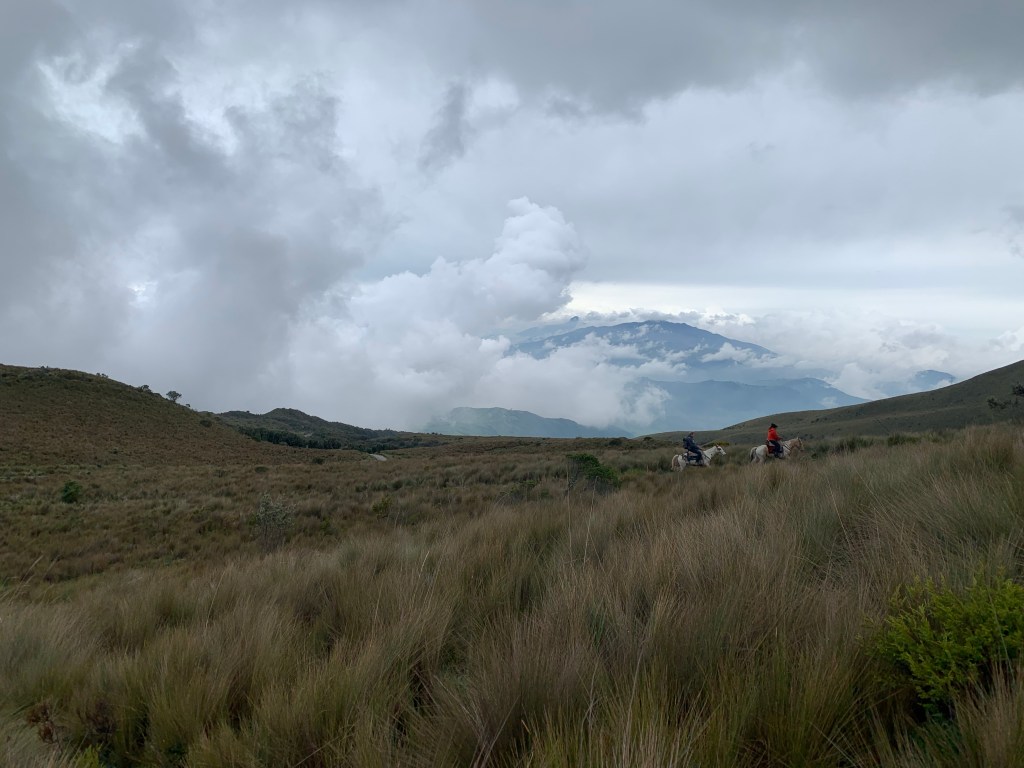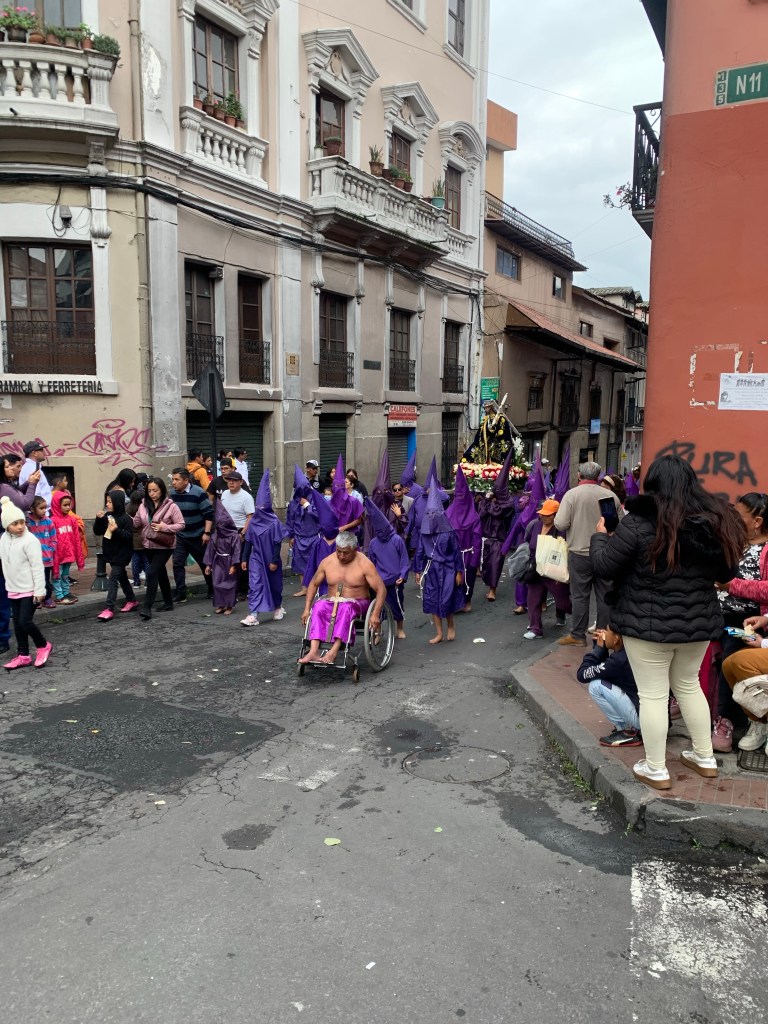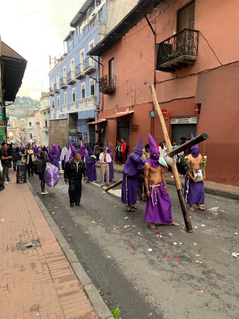 Am Freitag hieß es dann mit den 7 Sachen aufbrechen nach El Chaupi, ein mini Ort zwischen den Iliniza-Zwillingen und unserem Ziel, El Corazón. Doch am Weg zum südlich gelegenen Busbahnhof, schauten wir uns noch den Osterumzug an. Warum genau hier sich-peinigende lila KuKluxKlanmitglieder durch die Straßen zogen kann ich euch nicht erklären, anscheinend ist es irgendeine alte aus Spanien stammende christliche Tradition. Es war jedenfalls recht unterhaltsam. Dann ging es mit dem Bus nicht ganz 1,5h in den Süden. In dem kleinen kalten (!) Dorf angekommen, genossen wir erstmal ein bizzares (Nach-)Mittagessen, um welches wir uns mit den Straßenhunden streiten mussten (die waren eigentlich eh ganz lieb). Der Kälte geschuldet trieb es uns dann bald in den einzigen beheizten Raum der Unterkunft, den Aufenthaltsraum/Esszimmer. Nach dem Essen kamen wir noch mit einem dort aushelfendem Linzer ins Quatschen, er machte uns mächtig Sorgen bezüglich der Plausibilität des Besteigens des El Corazón ohne Bergführer und Helm. Wir liesen uns jedenfalls nicht davon abhalten es trotzdem zu probieren und gingen mit der Einstellung hinein nichts zu riskieren und im schlimmsten Fall früher umzukehren.