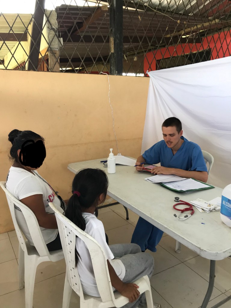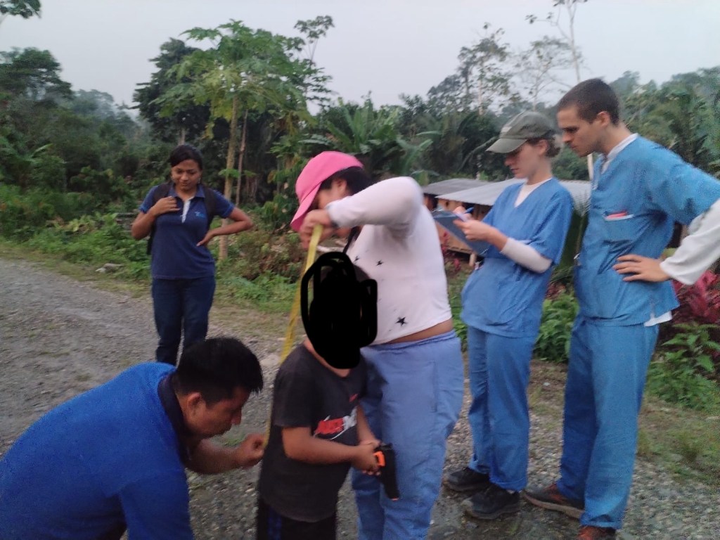 Am Mittwoch ging es dann kurz nach 7:00 los mit 2 Autos nach Arajuno, ein kleines Dorf das aber doch immerhin per asphaltierter Straße zu erreichen war und wo es zumindestens ein paar Geschäfte usw. gab. Organisiert wurde das ganze von einer evangelischen Organisation (Compassion Ecuador), deren Einheimischen Mitarbeiter uns organisatorisch unterstützten. Unser Feldquartier war eine Schule, in dessen größten Raum ein paar Stofffetzen als Raumteilung hingen und Plastiksessel und Stühle standen. Untersuchungsliegen gab es keine, falls notwendig wurden die Kinder gebeten sich auf den Tisch zu legen. Jedes Kind wurde zuerst abgewogen und vermessen, eines der Hauptaugenmerke war die Kontrolle des Wachstums mit altersentsprechender Wachstumskurve. Außerdem bekamen sie alle 10 Paracetamol geschenkt, sowie eine einmalige Entwurmungstherapie. Die meisten Kinder waren zwischen 8 und 15 Jahren alt, einige (Teenage)-Mütter kamen auch mit ihren Säuglingen.