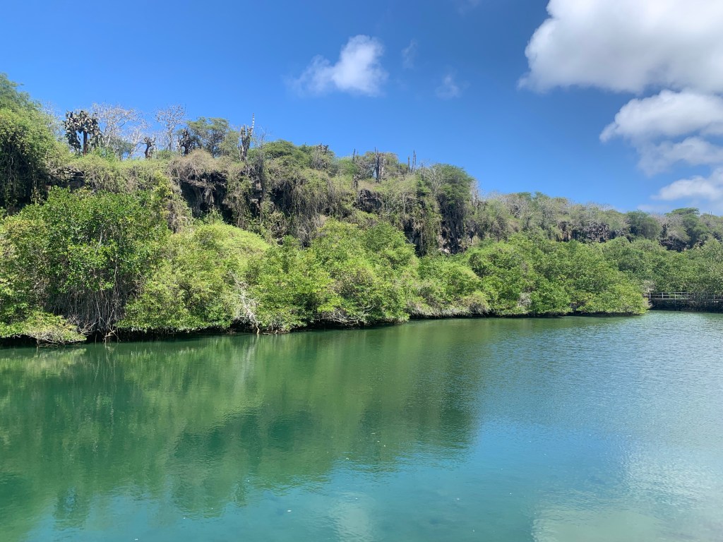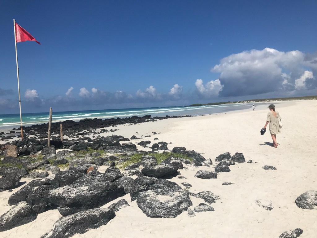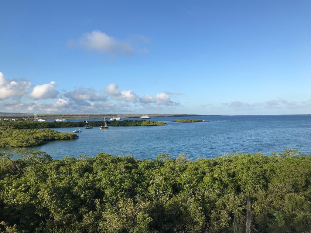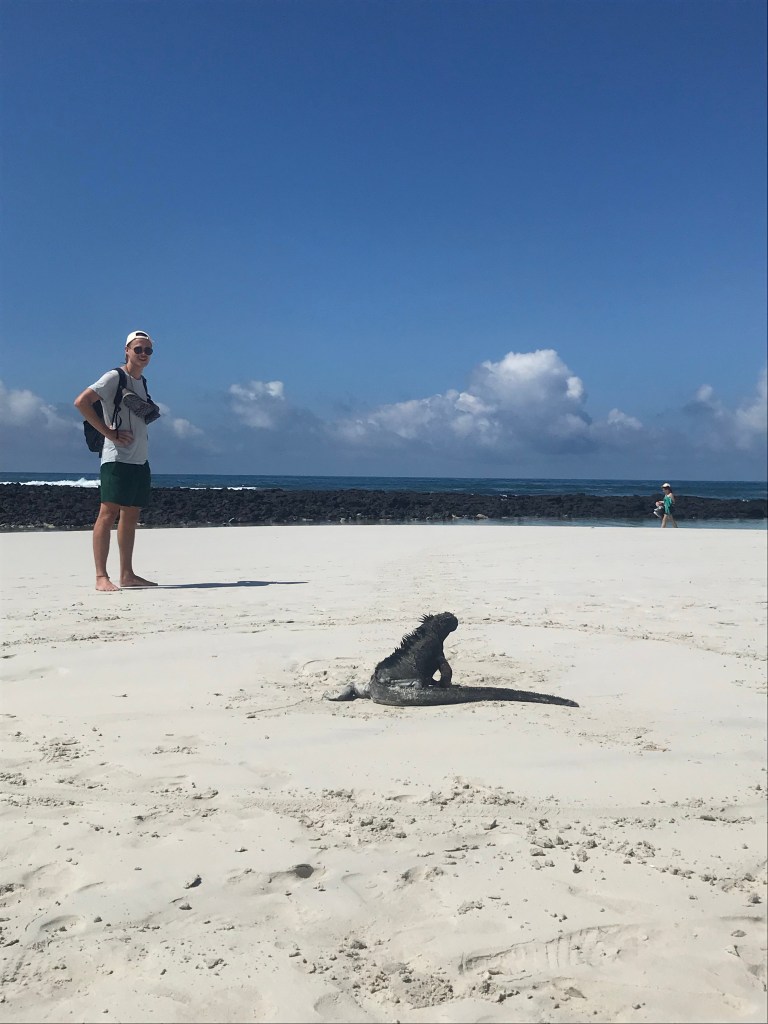 Wir landeten auf Santa Cruz (eigentlich auf Baltra, aber dort gibt es nicht wirklich was zu sehen) und verbrachten dort 2 Nächte. Auf Santa Cruz leben die meisten Menschen und es ist das kommerzielle Zentrum der Galapagosinseln, besonders was Souvenirshops angeht. Sie hat aber auch einiges zu bieten, so sah ich bereits aus dem Bus vom Flughafen zum Ort Puerto Ayora auf dem Gehsteig einfach so eine Riesenschildkröte spazieren, im Hafen liegen einige Seelöwen herum und ganz viele Pelikane, und abends konnte man sogar junge Reef-Haie beobachten. Wir marschierten an einem Tag in der glühenden Sonne zur Tortuga-Bucht, wo einer der schönsten und weißesten Strände auf uns wartete, und einige Meeresiguanas. Außerdem besuchten wir “Las Grietas”, Felsspalten in denen sich Salzwasser mit Süßwasser vermischt und man (halbwegs) gut schnorcheln kann, seit 2019 ist allerdings ein kostenpflichtiger Guide notwendig, der einem aber keinen Mehrwert bringt, also mittelmäßig gute Erfahrung. Frühstück und Abendessen richteten wir uns in unserer Unterkunft, da Essen gehen hier absurd teuer ist (unter 20 Dollar kommt man für eine Speise fast nicht weg). Außer das Mittagessen, das gibts wieder im Menü recht günstig (5-6$).