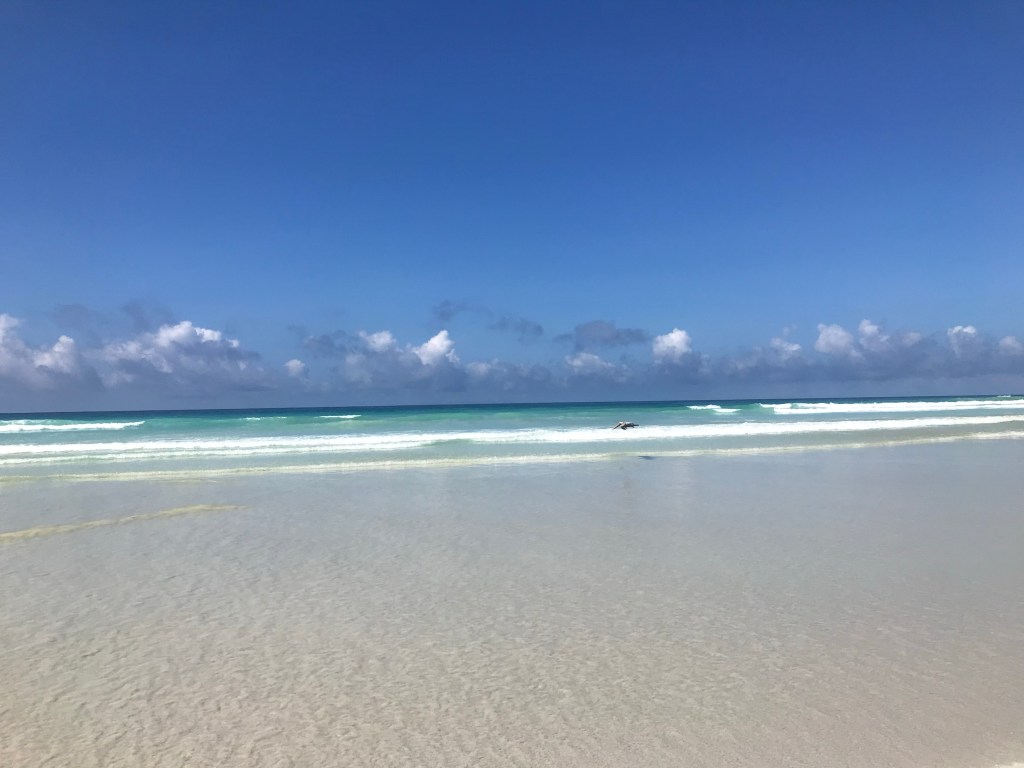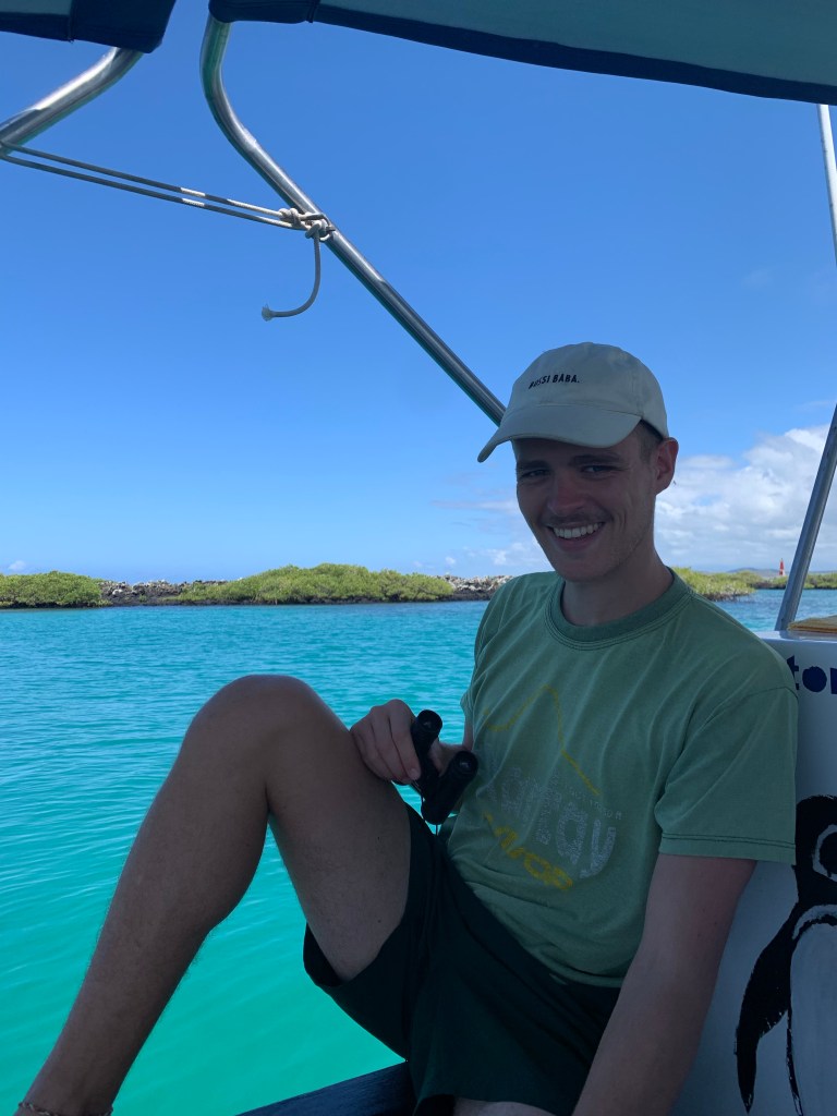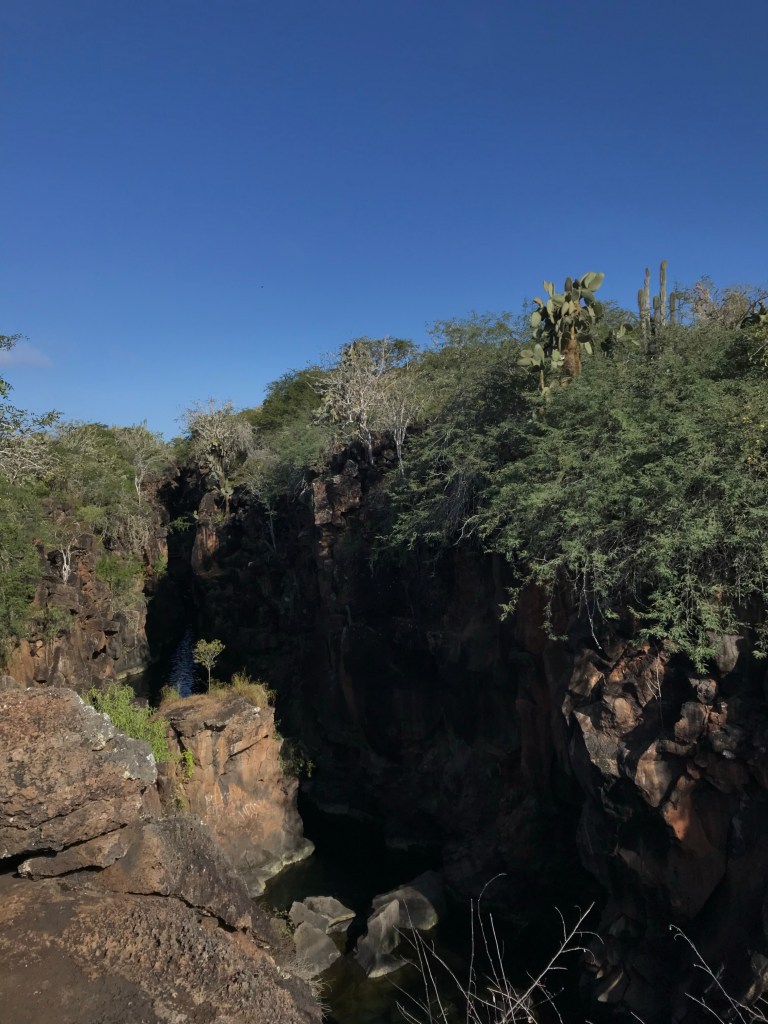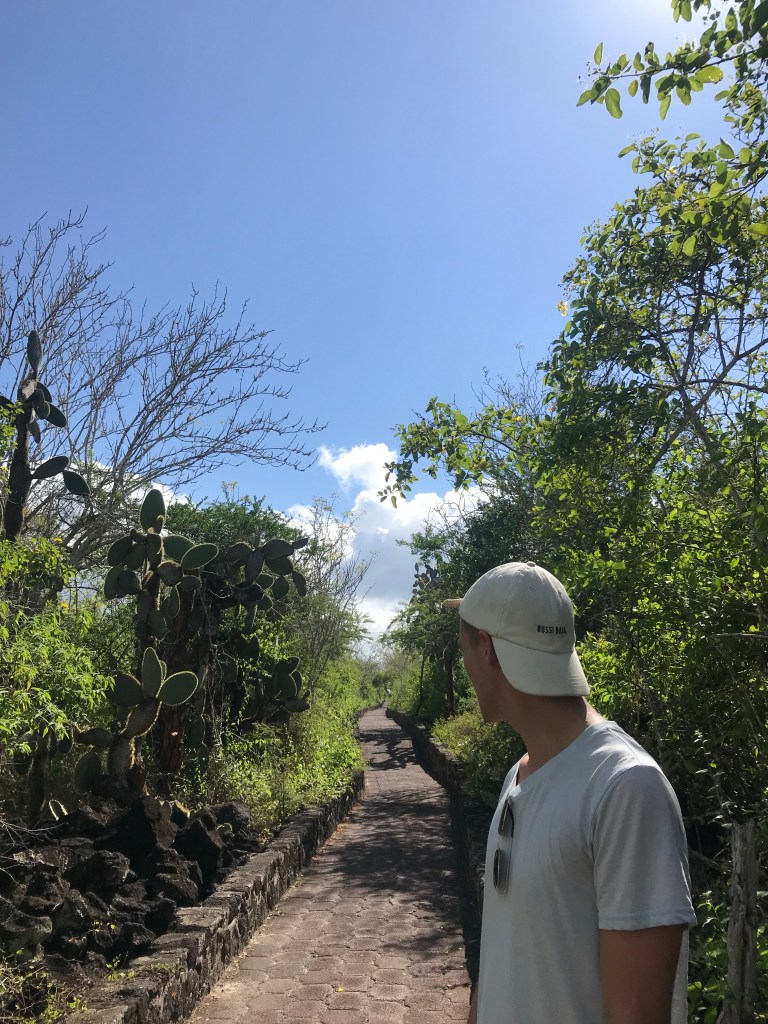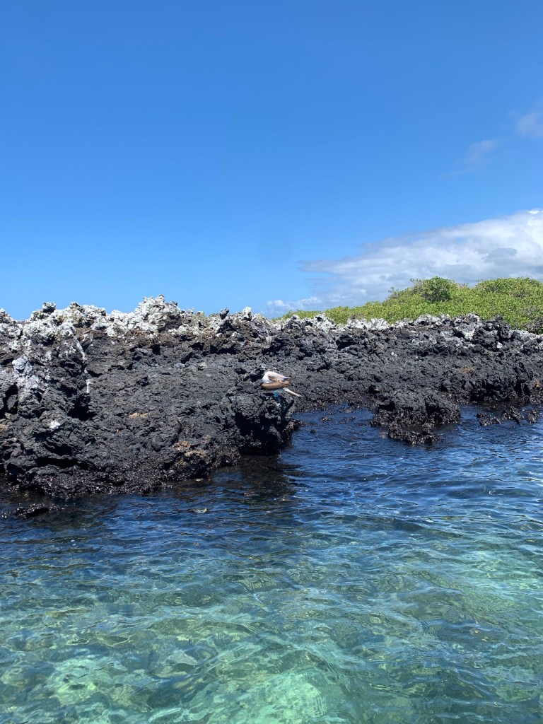 Wir landeten auf Santa Cruz (eigentlich auf Baltra, aber dort gibt es nicht wirklich was zu sehen) und verbrachten dort 2 Nächte. Auf Santa Cruz leben die meisten Menschen und es ist das kommerzielle Zentrum der Galapagosinseln, besonders was Souvenirshops angeht. Sie hat aber auch einiges zu bieten, so sah ich bereits aus dem Bus vom Flughafen zum Ort Puerto Ayora auf dem Gehsteig einfach so eine Riesenschildkröte spazieren, im Hafen liegen einige Seelöwen herum und ganz viele Pelikane, und abends konnte man sogar junge Reef-Haie beobachten. Wir marschierten an einem Tag in der glühenden Sonne zur Tortuga-Bucht, wo einer der schönsten und weißesten Strände auf uns wartete, und einige Meeresiguanas. Außerdem besuchten wir “Las Grietas”, Felsspalten in denen sich Salzwasser mit Süßwasser vermischt und man (halbwegs) gut schnorcheln kann, seit 2019 ist allerdings ein kostenpflichtiger Guide notwendig, der einem aber keinen Mehrwert bringt, also mittelmäßig gute Erfahrung. Frühstück und Abendessen richteten wir uns in unserer Unterkunft, da Essen gehen hier absurd teuer ist (unter 20 Dollar kommt man für eine Speise fast nicht weg). Außer das Mittagessen, das gibts wieder im Menü recht günstig (5-6$).