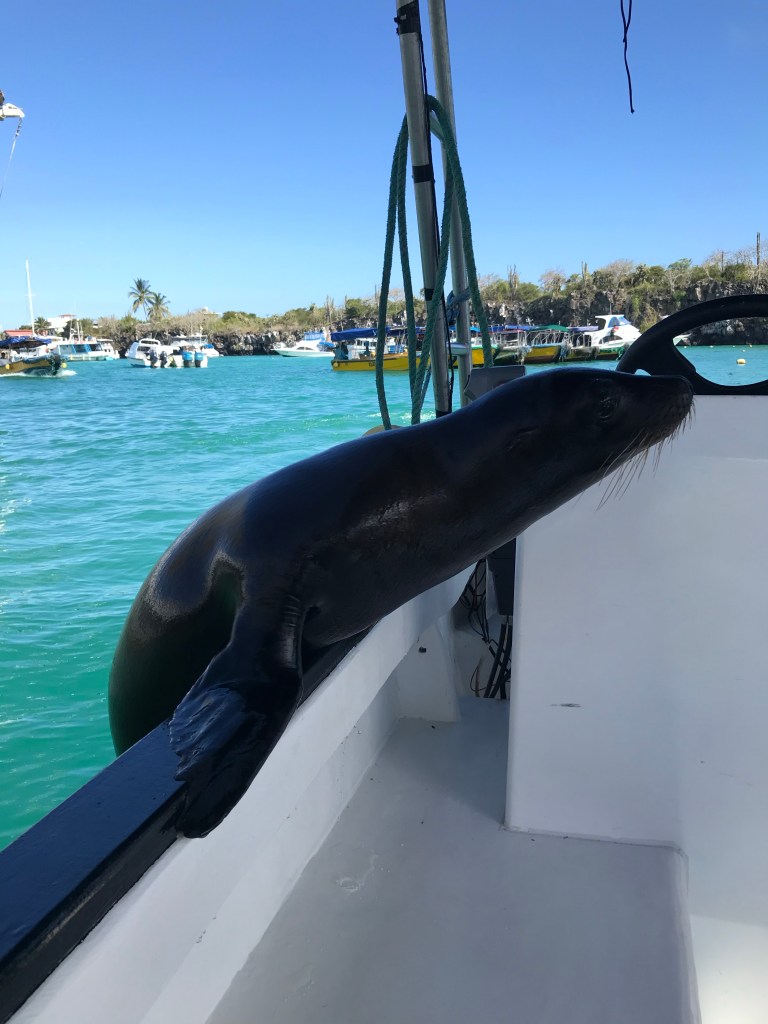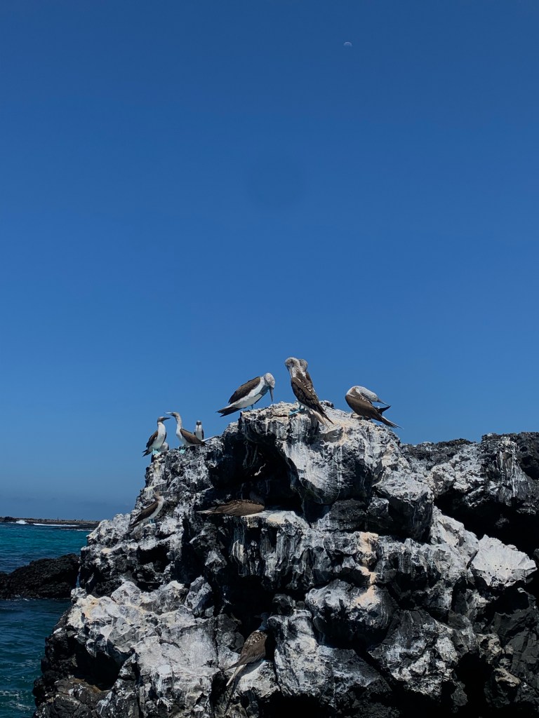Nach einem Transittag, an dem wir zuerst um 6:00 eine Fähre zurück nach Santa Cruz und dann um 15:00 eine Fähre weiter nach San Cristobal nahmen, kamen wir an unserem letzten Stopp in Puerto Baquerizo Moreno an. Wie sich hier herausstellte, ist es nicht immer gut die billigste Unterkunft zu nehmen. Die Bettwäsche war nicht frisch, das Klo stank nach Urin und die Küche war ultimativ grindig. So verließen wir nach einer Nacht in der Früh still und heimlich das Zimmer und buchten uns eine andere Unterkunft. Auf San Cristobal machten wir eine 360 Grad Tour, auf der man mit einem Boot die ganze Insel umfährt und an vielen coolen Spots stehen bleibt. Wir waren wieder ein paar mal schnorcheln, sahen vieeeeeeele Vögel und coole Felsformationen. Am letzten vollen Tag besuchten wir noch ein Museum, eine mega schöne Bucht und einen Strand vooooolllller Seelöwen, von denen es hier auf San Cristobal am meisten gibt. Das sind echt so süße Viecher, ur verspielt lassen sie sich von den Wellen hin und herspülen und teilweise sahen wir sie sogar “surfen”. Auch an Land sind sie nicht ganz so unfähig wie ihre Verwandten Robbenarten.