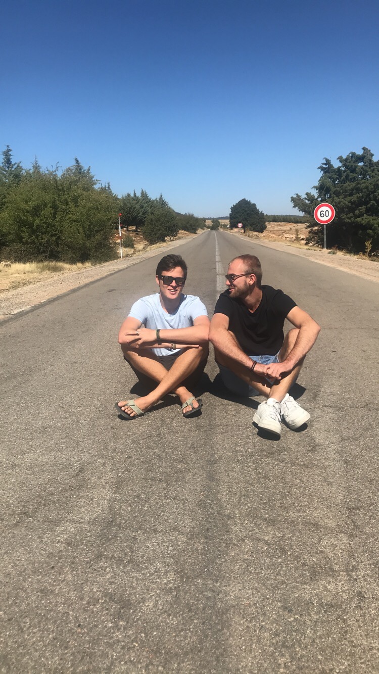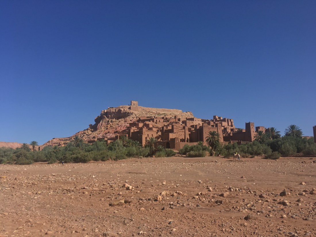 Recht zeitig hieß es dann auch wieder aufzustehen. In Wahrheit haben wir am zweiten Tag nicht viel in der Sahara gemacht außer die Landschaft/Stimmung zu genießen und zurück zu reiten. Bevor wir nach Aït Ben Haddou fuhren, hüpften wir noch schnell in den Pool und duschten den ganzen Saharasand ab. Die Autofahrt war landschaftlich die schönste von allen. Zuerst hat es ausgeschaut wie am Mars, kahler als kahl mit rauen, kantigen Gesteinsformationen. Später kamen wir durch Steppen die auch in Mittelafrika hätten sein können. Zu guter Letzt fuhren wir doch rote Schluchten mit grünen Palmoasen. Etwas erledigt schlossen wir den Tag mit einer billigen Speise und ein paar Runden Cambio auf einem chilligen Tisch, vor unseren Zimmern im freien, ab.