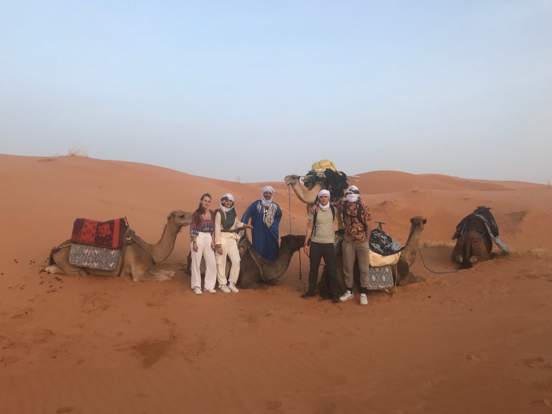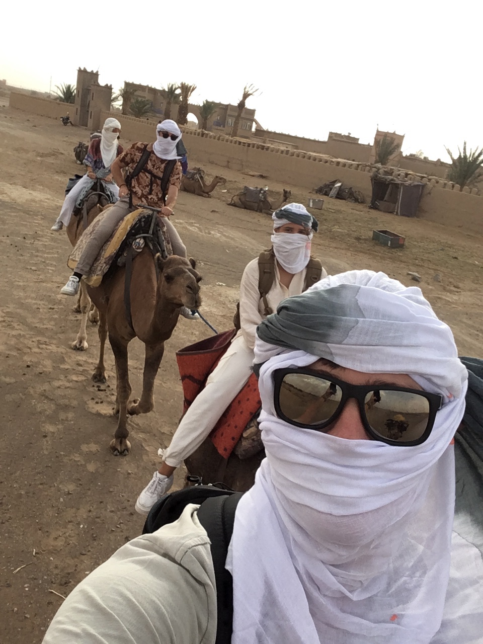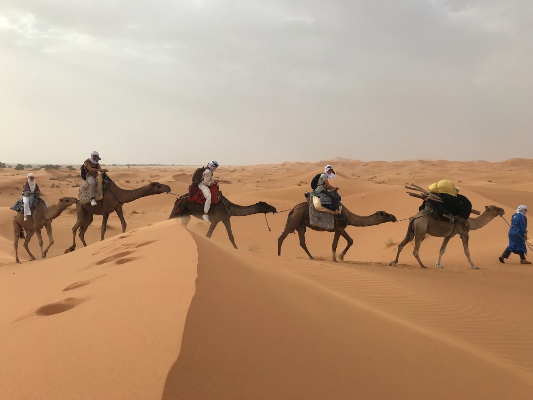Auf der Fahrt nach Merzouga – was auch das Tor zur Wüste genannt wird – wichen die Berge des Atlas langsam der kahlen Landschaft die ein Vorbote der größten Sandwüste der Welt war. Kurz nachdem die erste Düne in Sichtweite kam, erreichten wir auch schon das Hotel von dem aus die Tour startete. Wir packten unsere ganzen notwendigsten Sachen in die kleinen Rucksäcke, bekamen noch ein Tuch dass uns als Turban umgebunden wurde und dann gings hinauf auf die Kamele. Auf den Wüstenschiffen, begleitet von Hassan und Ibrahim (zwei Berbern), ging es also in Richtung der algerischen Grenze. Am Himmel zeichneten sich bereits ein paar Wolken ab, aber noch waren wir hoffnungsvoll, dass wir unter dem Sternenhimmel schlafen werden. Nach geraumer Zeit begannen unsere Guides nach einem geeigneten Platz fürs Zelt zu suchen, am besten geschützt vor dem ziemlich harschen Wind.