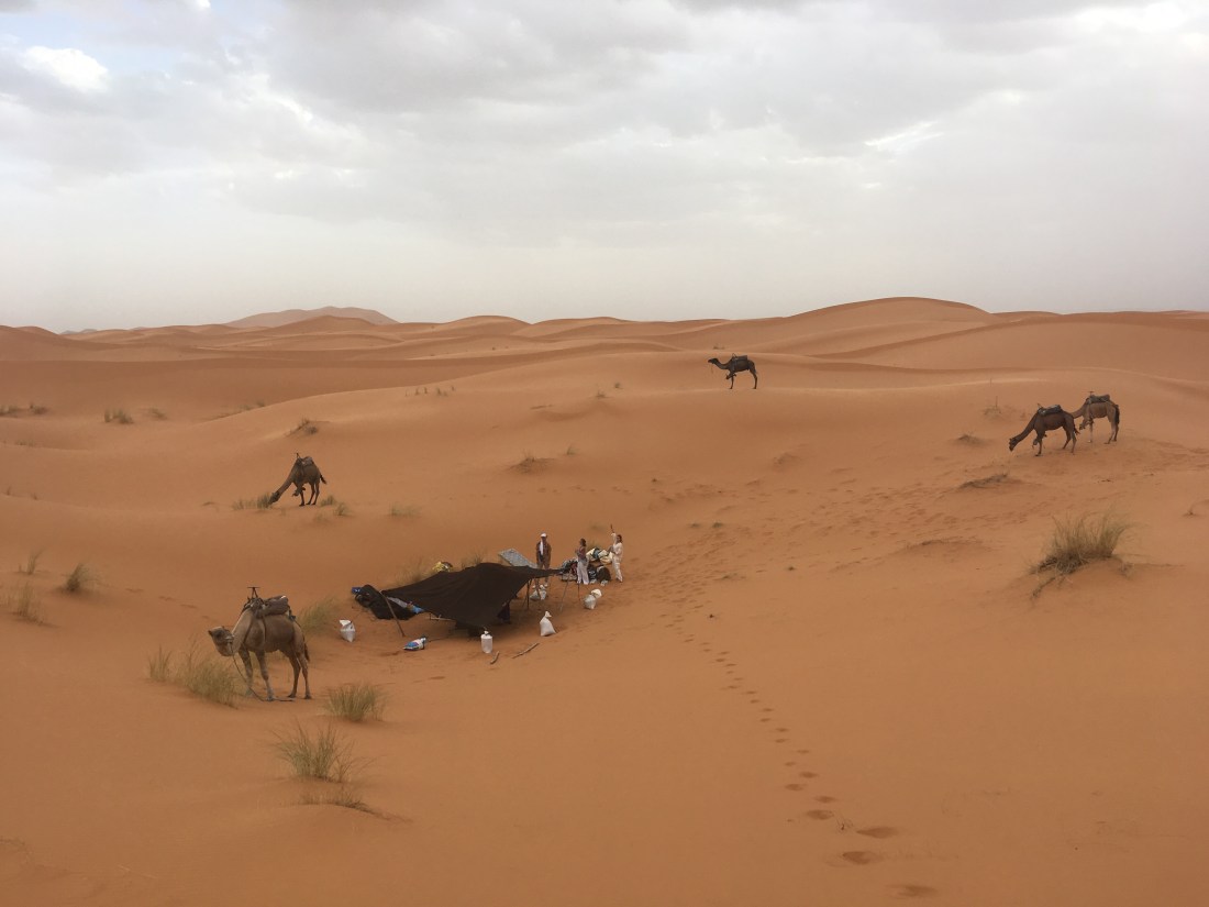 Einmal ein Örtchen gefunden, entluden wir zuerst die Kamele und halfen anschließend das Berberzelt aufzubauen. Im Prinzip sind es nur paar Holzpfähler, ein Stoff darübergeworfen, mit Schnürren an Säcke befästigt die wir mit Sand befüllt haben. Wir erkundeten dann ein wenig die Umgebung und fütterten/streichelten die Kamele während die Berber sich um die Vorbereitung des Essen kümmerten. Teilweise war es richtig schwer ohne Sonnenbrille die Augen offen zu halten weil der Sand so sehr durch die Luft beschleunigt wurde. Dieses Gefühl in jede Richtung zu schauen und nur Dünen zu sehen war schon etwas sehr besonderes. Es war zum Glück nichtmal so heiß, das lag wahrscheinlich hauptsächlich daran dass es leicht bewölkt war. Als wir zurück zum Zelt kehrten brannte bereits ein kleines Feuer. Es wurde langsam dünkler, aber nicht nur wegen der Uhrzeit. Pünktlich zum Abendessen begann es zu regnen. Es hat zwar nicht durchgeregnet aber insgesamt gab es sicher eine dreiviertel Stunde Niederschlag. Als Mahlzeit gab es schwarz angebranntes Huhn, Rindspieße und Salat (einfach aber erfüllt seinen Job). Wir brachten dem jüngeren der beiden Guides, Hassan, noch ein Kartenspiel bei und danach warfen wir uns auch schon in die hapfn. Sternenhimmel sahen wir leider keinen (auf Grund der Wolken), lediglich um halb 4 als ich aufs Klo gegangen bin hab ich ein paar gesehen, da war der Mond aber schon so weit oben dass er viele verdeckt hat mit seinem Licht. Aja geschlafen wurde übrigens auf alten Schaumstoffmatratzen, ich hab dann aber halb im Sand geschlafen weil das Stoffdach vom Zelt auf die obere Hälfte von meiner Matratze getropft hat.