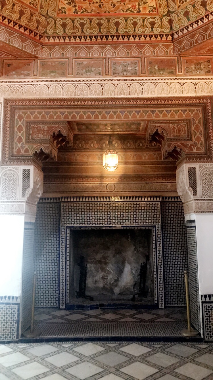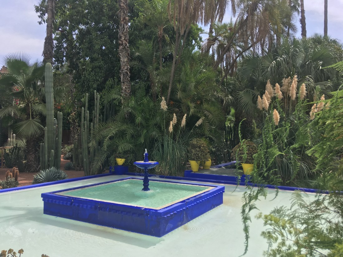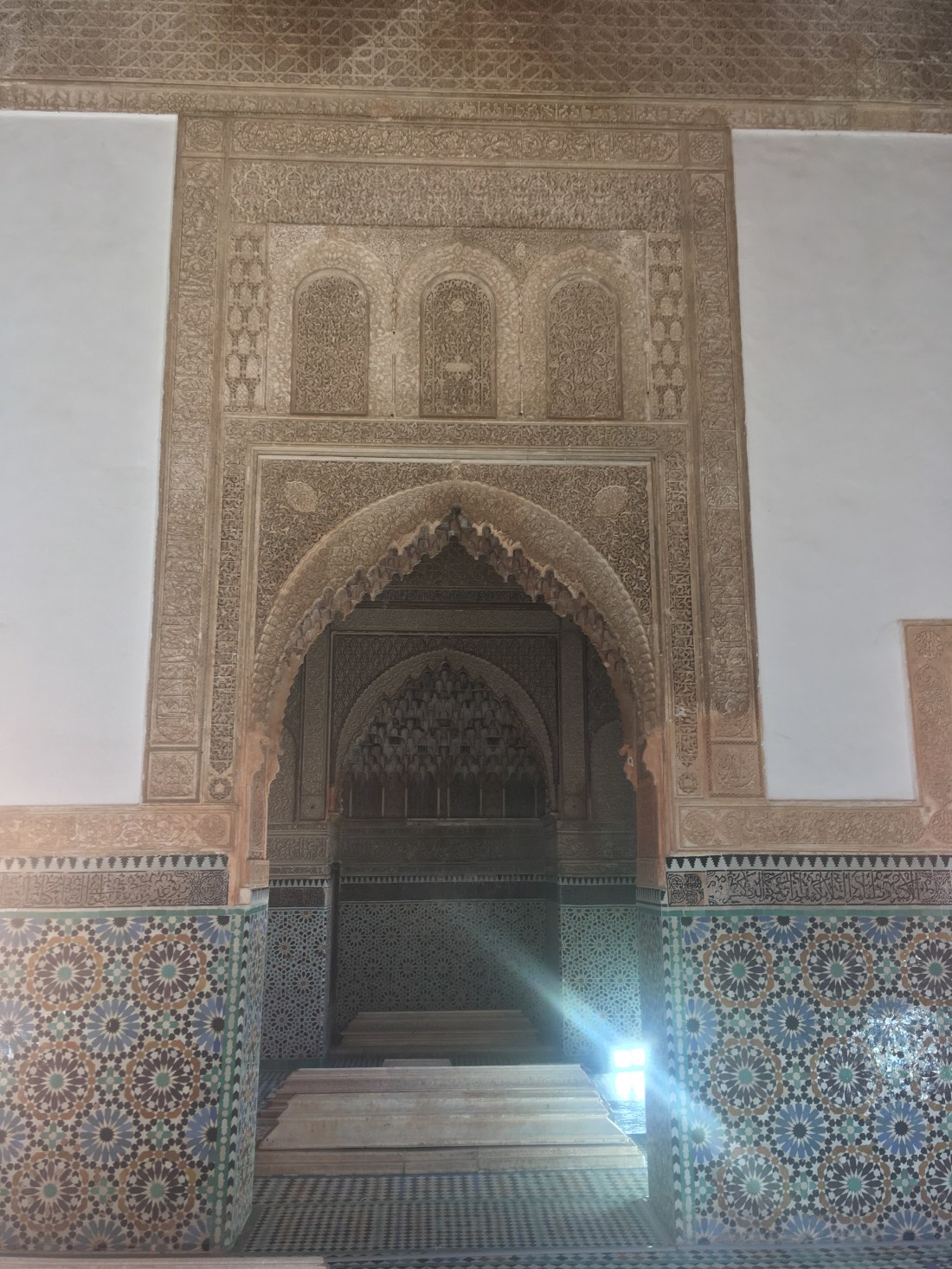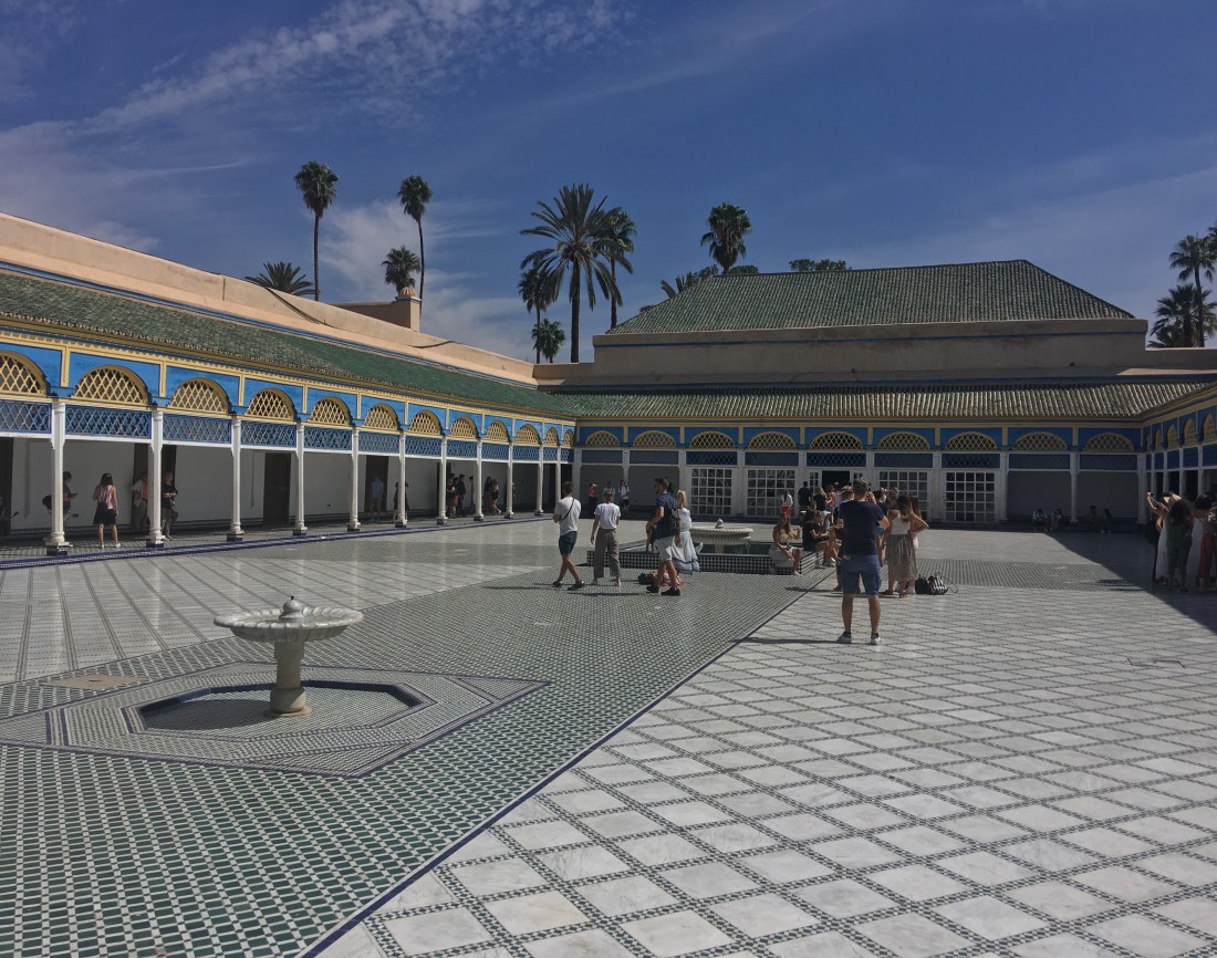 Am Freitag mussten wir um 10 das Auto zurück bringen, ausschlafen stand also nicht auf dem Tagesplan. Eine Sache die sich wie ein roter Faden durch den Urlaub zieht ist, dass wir nie zur vereinbarten Zeit das Hausverlassen/aufstehen/losfahren etc. An mir liegt es nicht, Namen will ich aber jetzt auch keine nennen. Auf jeden Fall erschienen wir dann, wie eigentlich schon erwartet, etwas zu spät bei der Autovermietung. Dürfte aber kein Problem gewesen sein und der kleine Kratzer vom Unfall ist auch nicht mehr unsere Sorge (Vollkasko ohne Selbstbehalt hat sich ausgezahlt). Von dort wurden wir dann von unserem für diesen (halben) Tag gebuchten Fahrer abgeholt. Er zeigte uns die Dinge die nicht in Gehweite der Medina waren, wie zb. den Jardin Majorelle (ein exotischer Garten von Yves Saint Lauren konzepiert), eine Gerberwerkstatt, einen offiziellen Markt mit verifiziert aus Marokko stammenden Handwerken, einen großen Gewürzladen usw. Über die restlichen Tage verteilt besichtigten wir noch den Palais Bahia, die Gräber der Sultanfamilie-Saadi, den Jardin Secret, ein Hammam (traditionel marokkanisches Wellness), besuchten ein Museum über die Kunst der Teppiche, schauten den Unterhaltern am riesigen Hauptplatz zu und bummelten durch die Souks (Märkte). Der Palais (und auch die anderen alten Gebäude) hatte wunderschöne Innenwände, die oft in drei Abschnitte geteilt waren; die untere Hälfte war mit Mosaiken bestückt, dann folgte ein Streifen aus Ton in den sie arabische Inschriften zeichneten wenn er noch frisch war und darüber war verziertes Holz.