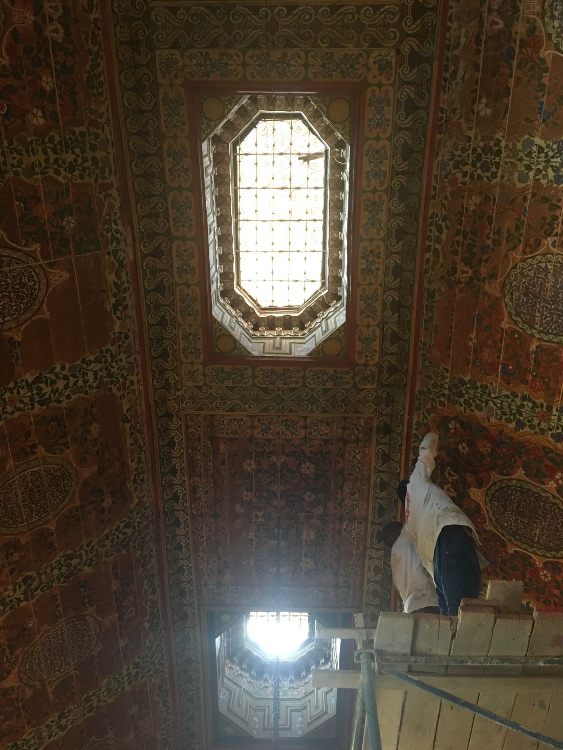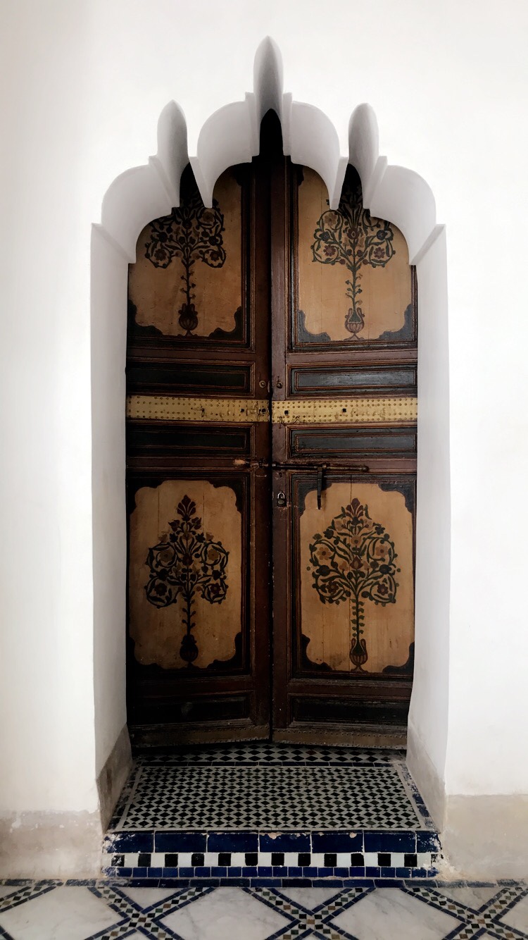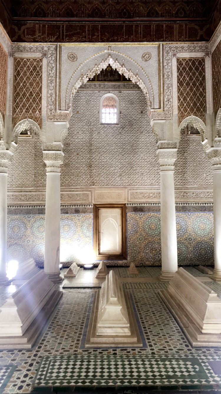 Am Freitag mussten wir um 10 das Auto zurück bringen, ausschlafen stand also nicht auf dem Tagesplan. Eine Sache die sich wie ein roter Faden durch den Urlaub zieht ist, dass wir nie zur vereinbarten Zeit das Hausverlassen/aufstehen/losfahren etc. An mir liegt es nicht, Namen will ich aber jetzt auch keine nennen. Auf jeden Fall erschienen wir dann, wie eigentlich schon erwartet, etwas zu spät bei der Autovermietung. Dürfte aber kein Problem gewesen sein und der kleine Kratzer vom Unfall ist auch nicht mehr unsere Sorge (Vollkasko ohne Selbstbehalt hat sich ausgezahlt). Von dort wurden wir dann von unserem für diesen (halben) Tag gebuchten Fahrer abgeholt. Er zeigte uns die Dinge die nicht in Gehweite der Medina waren, wie zb. den Jardin Majorelle (ein exotischer Garten von Yves Saint Lauren konzepiert), eine Gerberwerkstatt, einen offiziellen Markt mit verifiziert aus Marokko stammenden Handwerken, einen großen Gewürzladen usw. Über die restlichen Tage verteilt besichtigten wir noch den Palais Bahia, die Gräber der Sultanfamilie-Saadi, den Jardin Secret, ein Hammam (traditionel marokkanisches Wellness), besuchten ein Museum über die Kunst der Teppiche, schauten den Unterhaltern am riesigen Hauptplatz zu und bummelten durch die Souks (Märkte). Der Palais (und auch die anderen alten Gebäude) hatte wunderschöne Innenwände, die oft in drei Abschnitte geteilt waren; die untere Hälfte war mit Mosaiken bestückt, dann folgte ein Streifen aus Ton in den sie arabische Inschriften zeichneten wenn er noch frisch war und darüber war verziertes Holz.