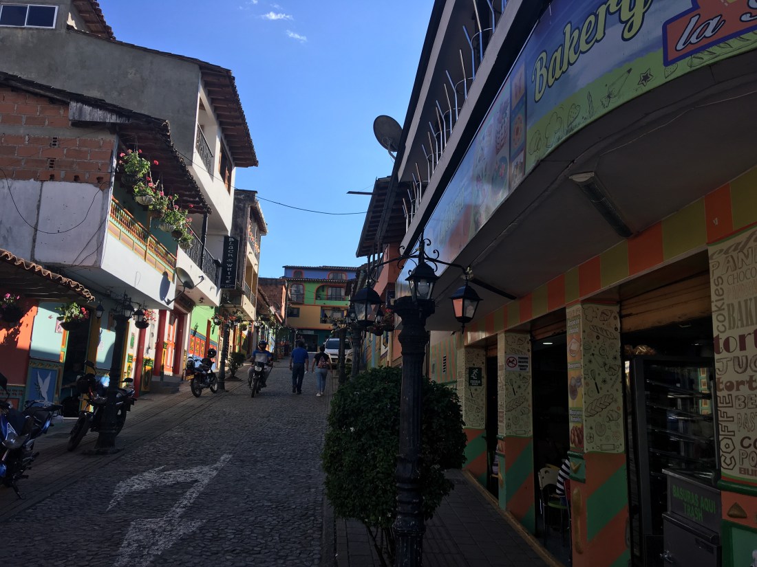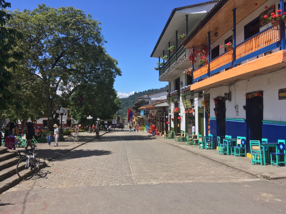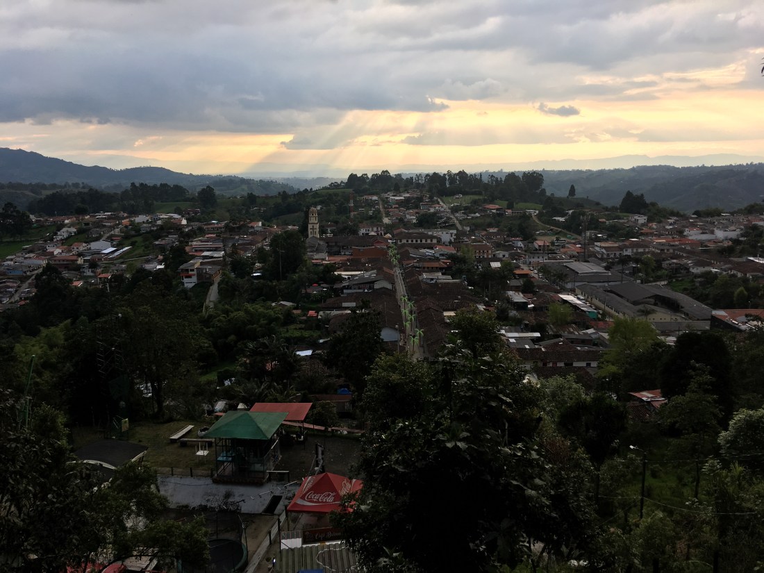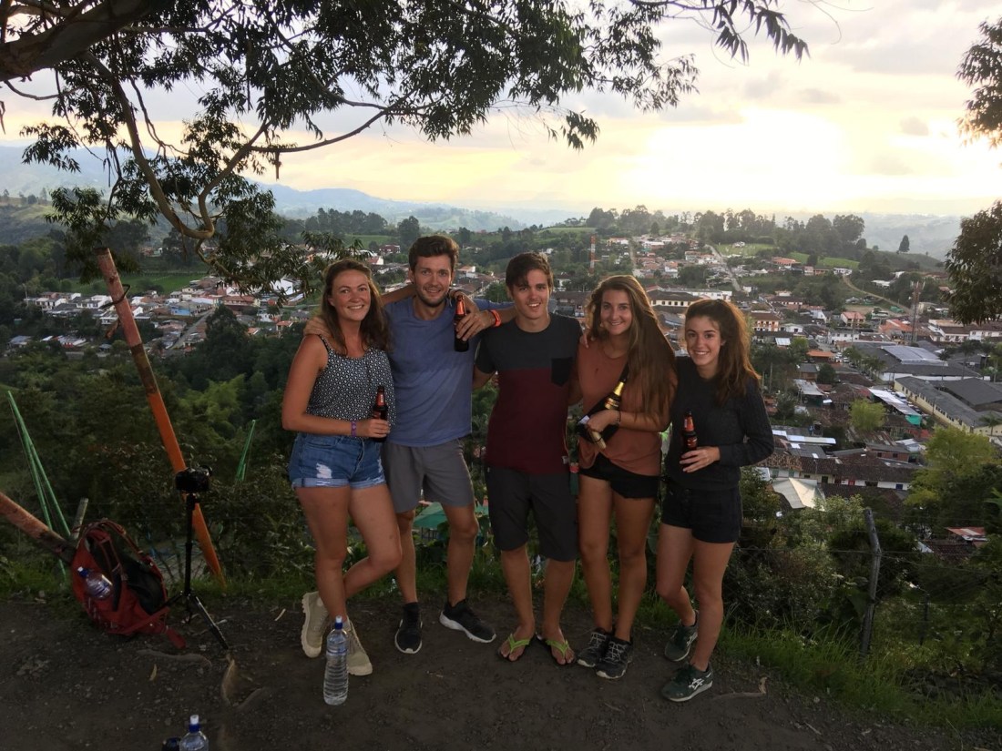 In Salento angekommen querten wir das kleine Dorf um bei einem uns vorgeschlagenen Hostel nach Betten zu fragen; schon am Weg dorthin hörten wir allerdings andere Reisende untereinander reden, dass dieses komplett ausgebucht ist. Wir versuchten es trotzdem und wurden wie zu erwarten weggeschickt. Vor dem Eingang zu unserer nächsten Wahl hörten wir auf einmal von einem der umliegenden Dächer unseren Namen gerufen. Die Stimmen gehörten einem Amerikaner (Ryan) und einer Deutschen (Karo) die wir jeweils in Guatape und Medellin getroffen haben. Sie überredeten uns nach kurzem hin und her in ihr Hostel zu kommen. Für die folgenden zwei Tage wurde unsere Gruppe demnach auf 5 Personen erhöht. Auf die anstrengende Reise folgte an diesem Tag nur mehr ein billiges einheimisches Restaurant und eine kurze aber sehr lustige Nacht auf unserer Dachterrasse.