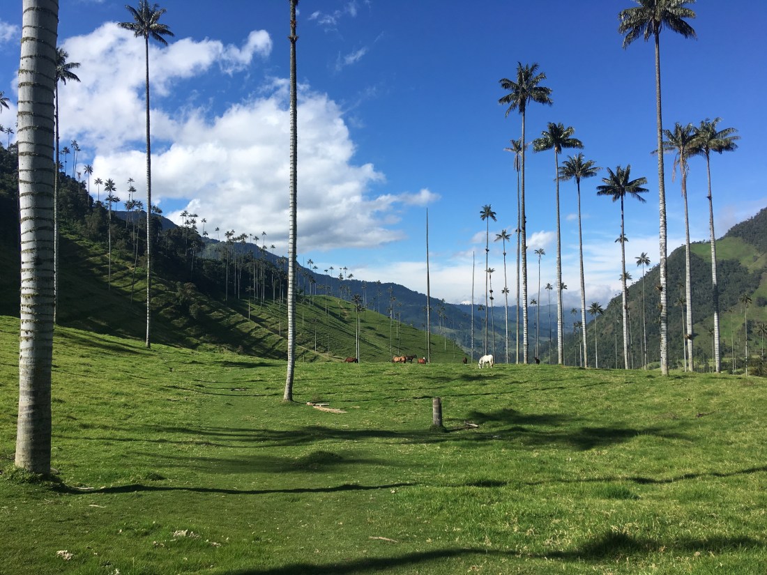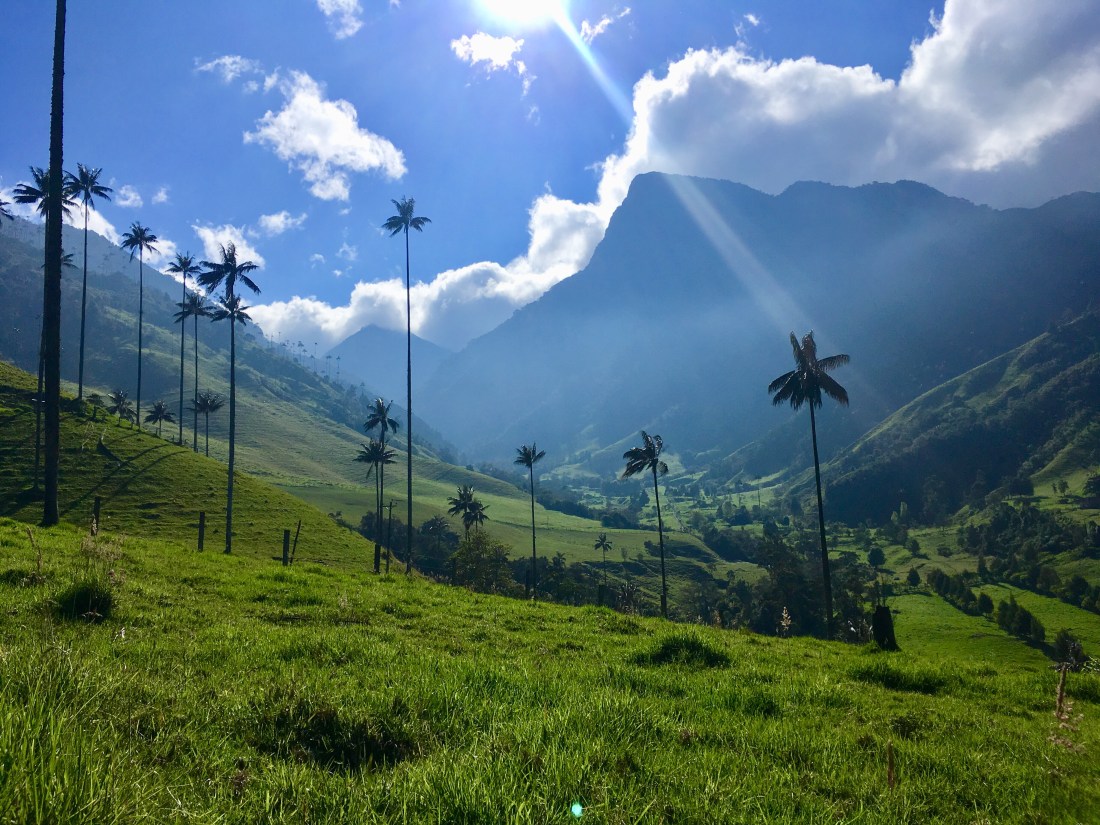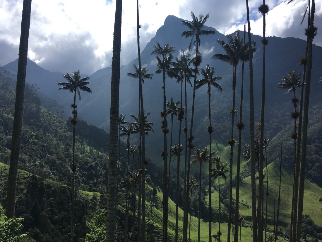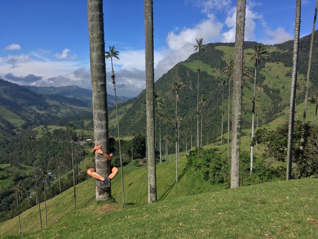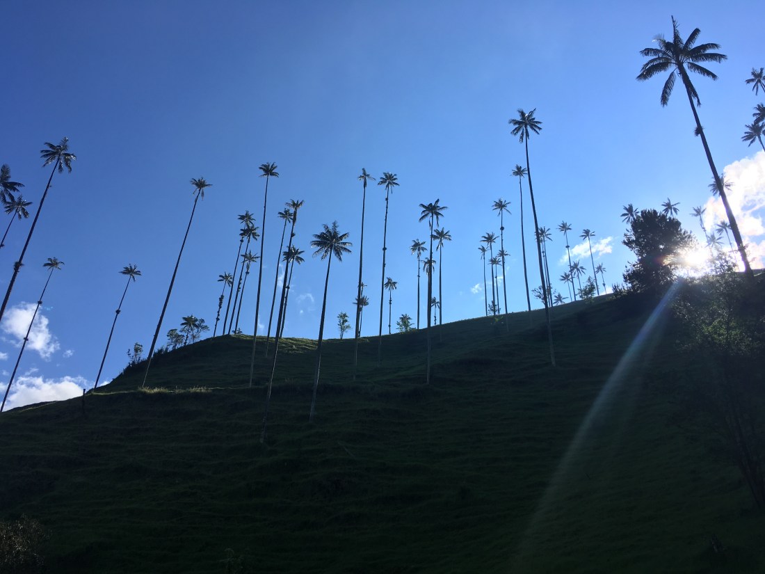 Der nächste Morgen war demnach kein einfacher. Wir schafften es dennoch uns aus dem Bett zu raffen, Frühstück zu machen und einen der ersten Jeeps zu nehmen. Die fahrt zum Valle de Cocora, welches die höchsten Palmen der Welt behaust, war landschaftlich wohl eine der schönsten bis jetzt. Ich stand hinten auf einem Trittbrett und konnte so Fahrtwind und Aussicht genießen. Eine Menge Leute (Clemens, Hannah, Helena und Wolfi inkludierend) empfohl uns den Trek entgegen die vorgegeben Richtung zu machen, also gingen wir schnurstracks am Eingang vorbei und erblickten den Palmenwald wenig später. Ein weiterer Vorteil daran war, dass das Wetter in der Früh wesentlich viel besser war als zu Mittag/am frühen Nachmittag. Die Wanderung dauerte länger als gedacht, wahrscheinlich lag das aber daran, dass wir viele Pausen einlegten und einmal länger bei einem Aussichtspunkt im Gras lagen und gemeinsam litten 🙃. Am Weg lag außerdem ein Hütte mit Futterstelle für Kolibris; kaum einfangbar mit der Handykamera die kleinen Racker, aber sehr interessante und schöne Vögel! Das letzte Stück war entlang eines Flusses durch dichten Regenwald, immer wieder sah man auf den Hang mit dem Palmenwald, dieser war aber zu dieser Zeit bereits in Wolken gekleidet.