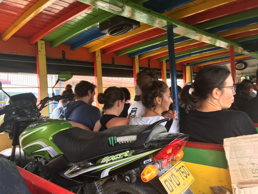 Vorgestern (mittlerweile ist es Vorvorvorgestern) hieß es früh aufzustehen, da wir eine lange Busfahrt vor uns hatten. Lange im eigentlichen Sinne war sie gar nicht, ca 200 Kilometer. Für die ersten 50km haben wir allerdings vier Stunden gebraucht und nach weiteren guten vier Stunden kamen wir erst in Salento an – wir hatten aber eigentlich fast Glück, angeblich haben Manche mehr als zwölf Stunden für den gleichen Weg gebraucht. Der erste Teil der Strecke wurde in einem Billigmarken chickenbus zurückgelegt. Danach gings in einem moderneren, aber dennoch unangenehmen, Shuttlebus weiter.
