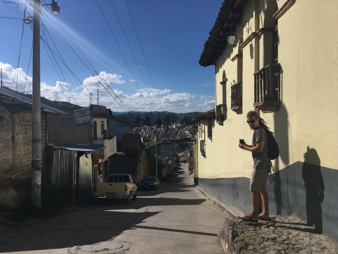 Einmal borgten wir uns am frühen Vormittag ein Kayak aus und überquerten den See zum Playa Las Cristalinas, anschließend paddelten wir zum Ort San Juan und schließlich zurück. Das ganze dauerte ca 3,5 Stunden (nicht alle davon wurden im Kayak verbracht) und wir paddelten etwa 6 Kilometer. Lago de Atitlan glich an diesem Tag eher einem Meer, was dem Unterfangen einen abenteuerlichen Hauch verlieh. Der angeblich kristallklare Strand war nicht besonders schön, wirklich ins Wasser gehen wollten wir aber sowieso nicht. Der Nachbarsort bestand interessanter Weise zu ungefähr 80 Prozent aus Kunstgeschäften, die alle die gleiche Art von Bildern verkauften. Ansonsten war er ganz nett, aber auch nicht der Höhepunkt des Ausfluges. Dieser war dann wohl doch das kayaken selbst.
