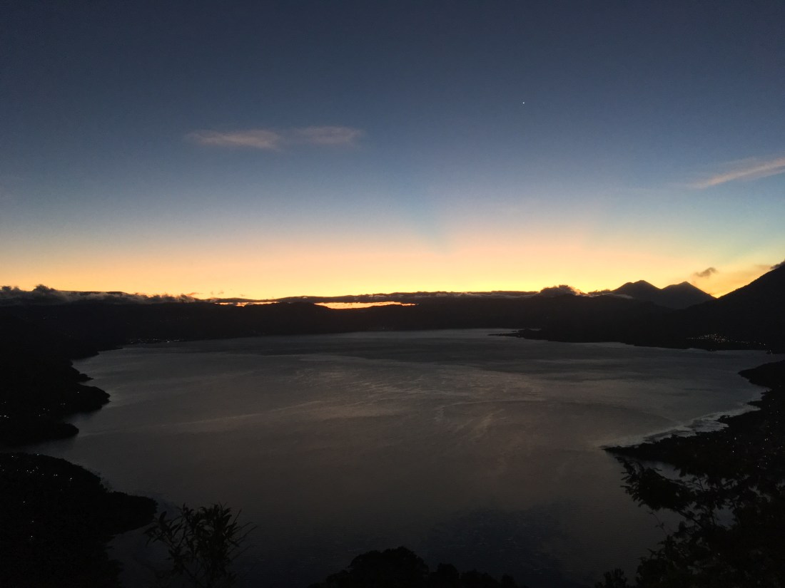 Einen anderen Tag sind wir um 3:30 aufgestanden und wurden mit einem Minivan zur Nariz del Indio – ist ein Teil der Bergformation die wie ein Gesicht ausschaut – gebracht. Von dort wanderten wir (eine Gruppe von 5 Touristen und 2 Guides) etwa eine halbe Stunde bei Sternen- und Stirnlampenlicht zur Aussichtsplatform. Die Uhr zeigte kurz vor 5 an als wir dort eintrafen. Während die Guides für uns Kaffee über einem kleinen Feuer kochten, bestaunten wir den Sternenhimmel, den schimmernden See und die Lichter der vielen Dörfer um das große Gewässer. Mit ein wenig Glück sahen wir sogar einen am Horizont liegenden Vulkan ausbrechen. Da es noch dunkel war, konnte man trotz der Distanz wunderbar sehen, wie sich die Lava über den gesamten Gipfel ausbreitete bis sie kurz danach versteinerte (oder zumindestens nicht mehr so stark glühte, dass sie von der Distanz sichtbar war). Ein einzigartiger Anblick. Noch bevor der Horizont anfing Farbe anzunehmen, hörte man die nahe gelegenen Dörfer – die doch ca. 1 Kilometer weiter unten lagen – erwachen. Zuerst das Bellen der Hunde, dann die Hähne, und mit den ersten Sonnenstrahlen auch die ein oder andere Kirche (es war immerhin Sonntag). Alles in allem war es meiner Meinung nach ein magischer Morgen. Leider war bei der Rückfahrt ein Teil der Straße gesperrt, so warteten wir zuerst im Auto eine halbe Stunde, bis unser Fahrer gemeint hat wir fahren mit dem Boot weiter, auf das wir nochmal eine halbe Stunde gewartet haben.