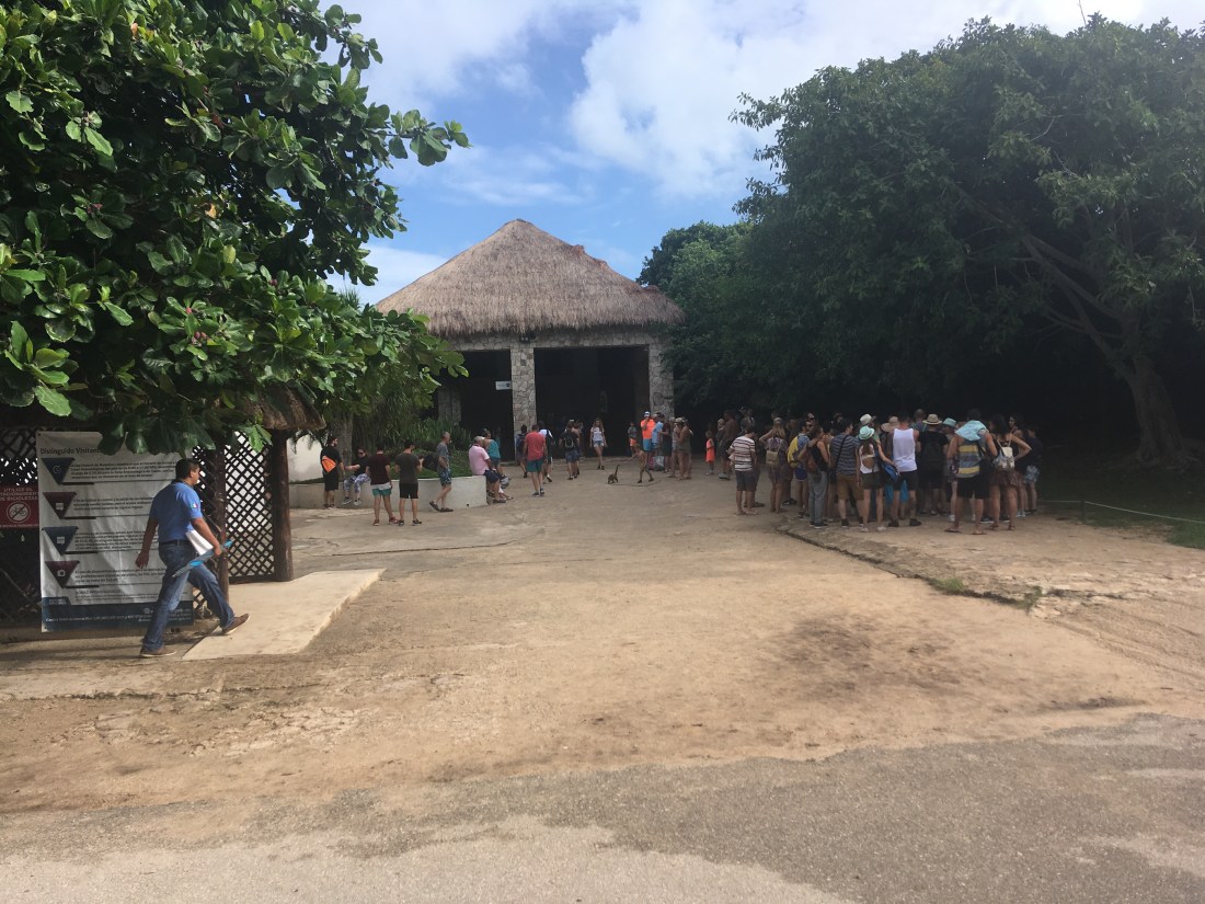 Der (mittlerweile gestrige weil kein Wlan) Tag fing mit dem Gedanken an, noch vor dem Frühstück uns die Ruinen von Tulum anzuschauen, um den Buslieferungen an Touristen zu entkommen (sowie der mexikanischen gelben Sau, auch die lies aber nicht lang auf sich warten). In der Realität wars dann so, dass wir in etwa 5 Minuten vor Eröffnung der Pforten dort waren (7:55), aber schon vereinzelte Schaulustige in der Schlange zum Eingang standen. Am Anfang der Besichtigung mussten wir die Mayatempel also immerhin nur mit ein paar Wenigen teilen. Nach kurzer Zeit kamen dann aber riesige Reisegruppen – vorwiegend Russen – die uns leider etwas den Anblick vermiesten. Abkühlung am “Maya-Beach” wurde uns auch verwährt auf Grund von zu starkem Wind. Hungrig und ein wenig enttäuscht radelten wir also zum Hostel zurück um noch schnell ein Frühstück zu uns zu nehmen und dann die nähesten Cenoten auszuchecken.