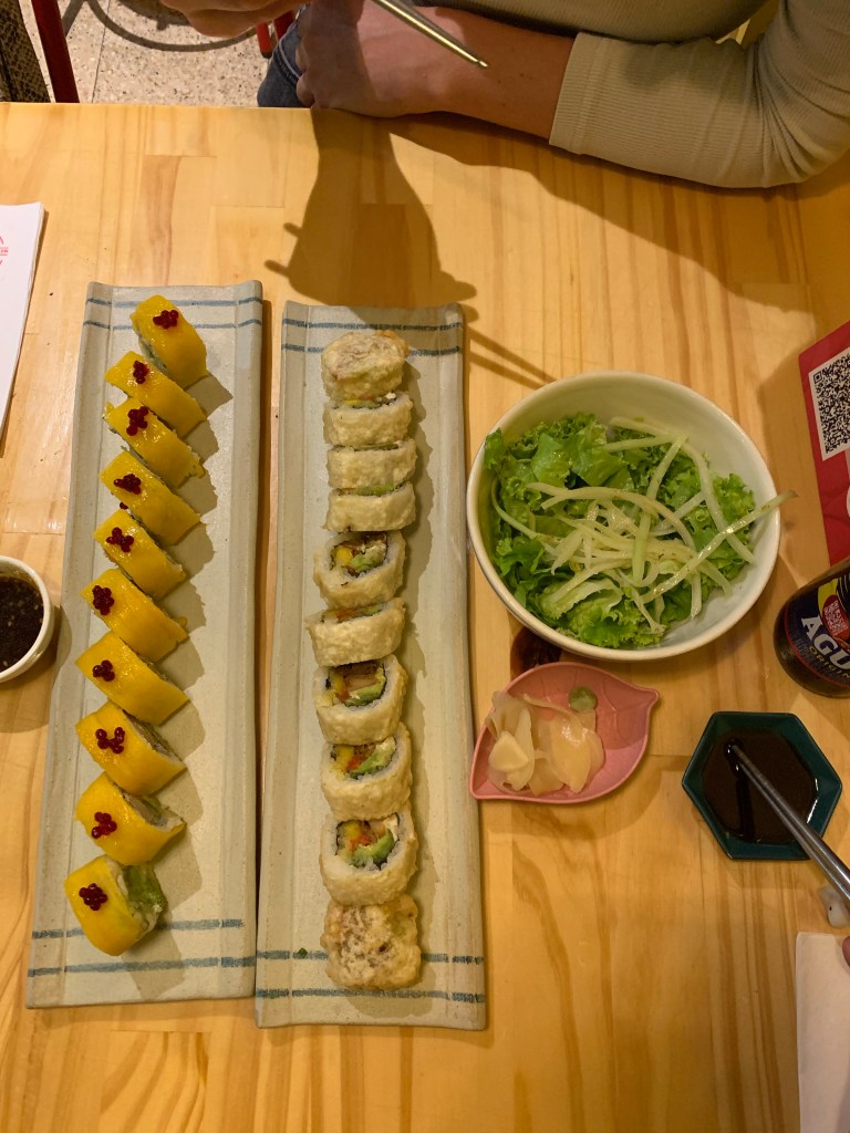 Auch die restlichen Tage weichten wir vom Standardprogramm ab, zum Beispiel besuchten wir einen Aquapark um uns gegen das untypisch heiße Wetter zu schützen. Die hatten dort ziemlich viele Regeln, so mussten wir Badekappen tragen und die Schwimmbäder waren eingezäumt – einziger Zugang war durch eine forcierte Dusche. Zu unserem Feel-good-Programm gehörte außerdem eine Yogaklasse und Sushi.